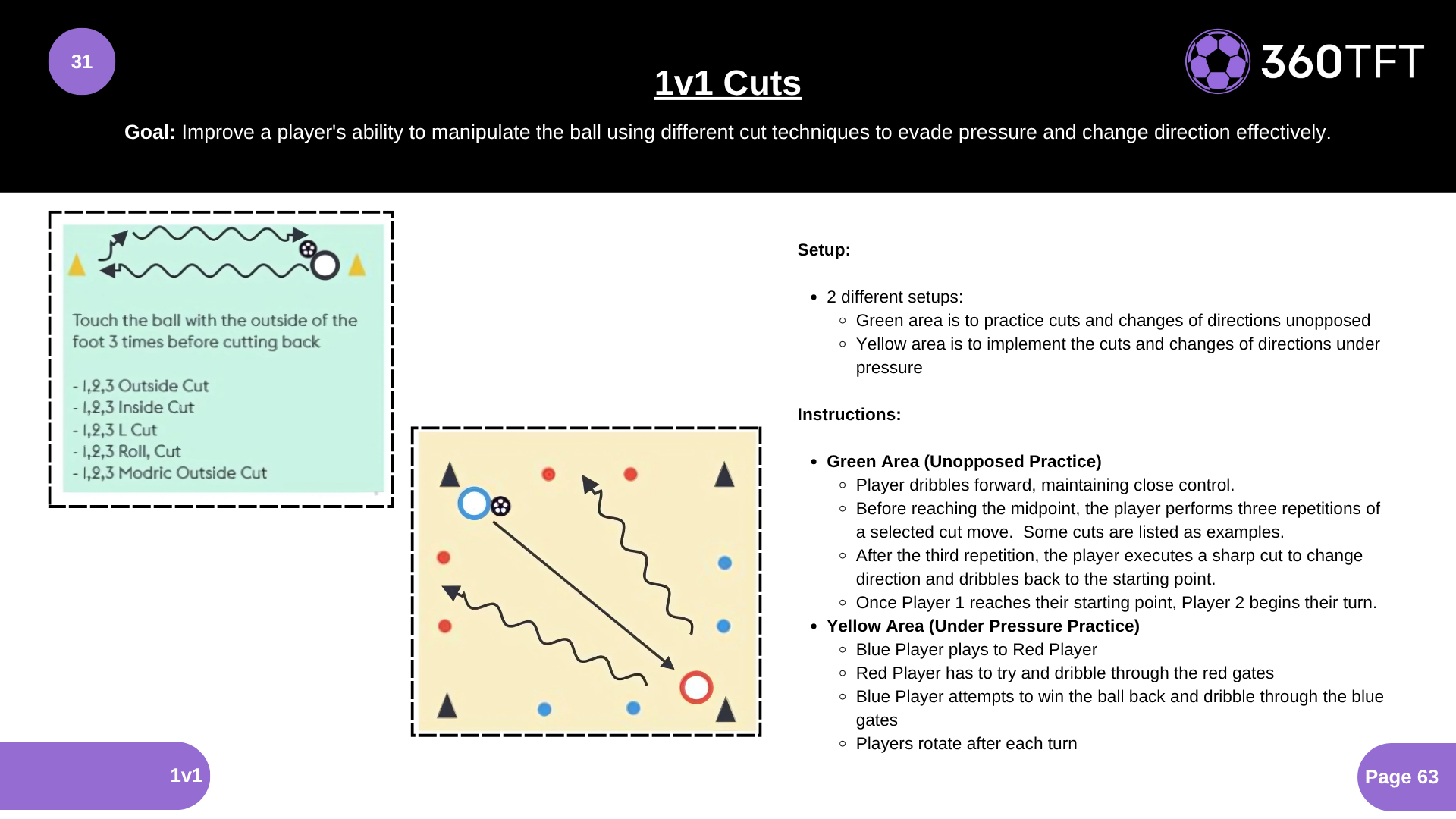 • Green Area (Unopposed Practice) • Player dribbles forward, maintaining close control. • Before reaching the midpoint, the player performs three repetitions of a selected cut move. Some cuts are listed as examples. • After the third repetition, the player executes a sharp cut to change direction and dribbles back to the starting point. • Once Player 1 reaches their starting point, Player 2 begins their turn. • Yellow Area (Under Pressure Practice) • Blue Player plays to Red Player • Red Player has to try and dribble through the red gates • Blue Player attempts to win the ball back and dribble through the blue gates • Players rotate after each turn