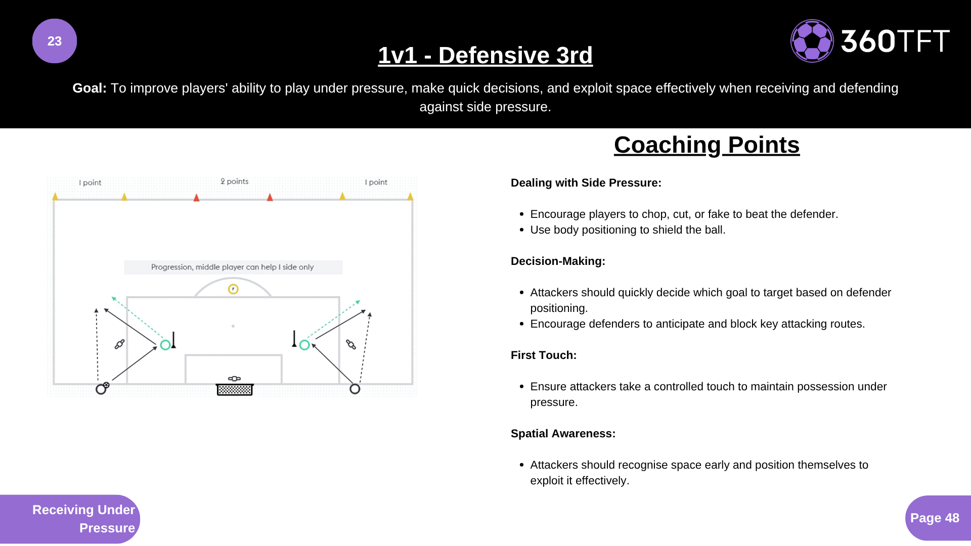 Dealing with Side Pressure: • Encourage players to chop, cut, or fake to beat the defender. • Use body positioning to shield the ball. Decision-Making: • Attackers should quickly decide which goal to target based on defender positioning. • Encourage defenders to anticipate and block key attacking routes. First Touch: • Ensure attackers take a controlled touch to maintain possession under pressure. Spatial Awareness: • Attackers should recognise space early and position themselves to exploit it effectively.