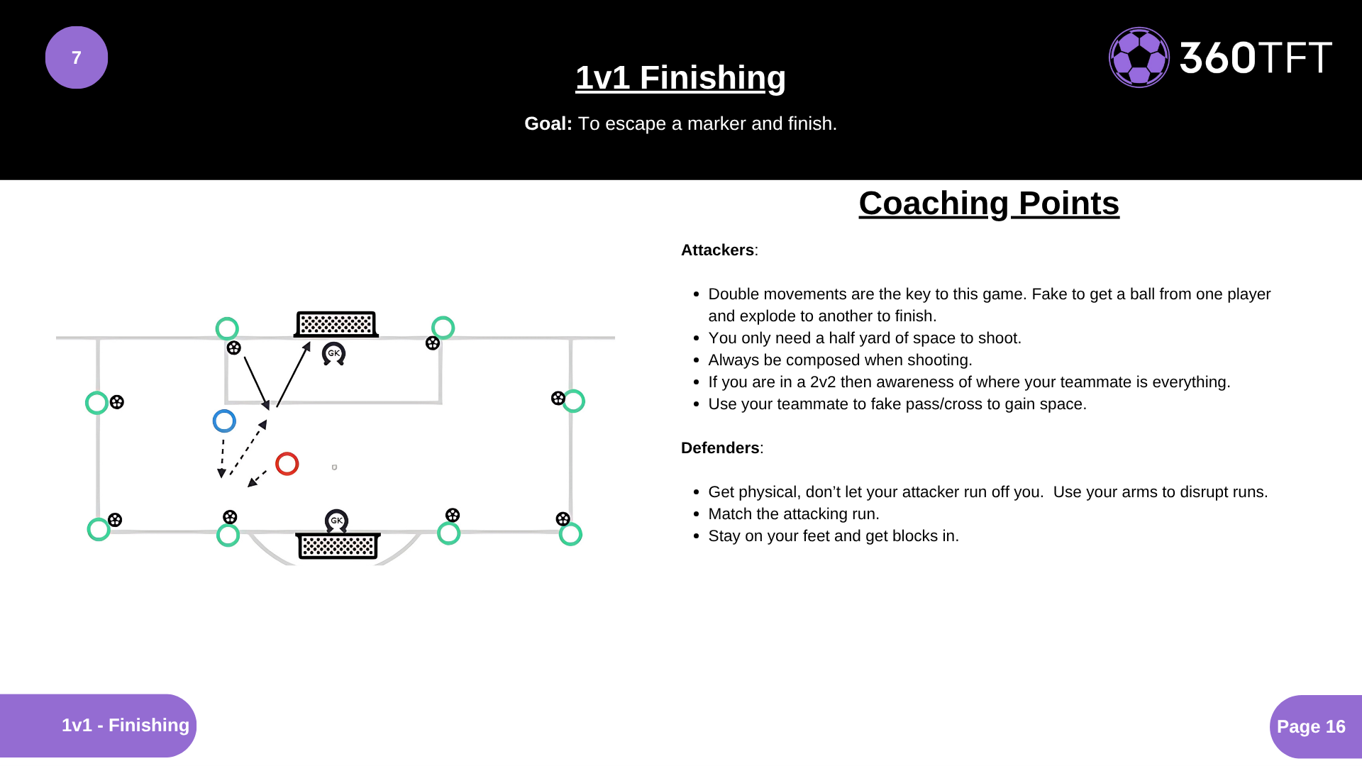 Attacker Instruction: Double movements are the key to this game. Fake to get a ball from one player and explode to another to finish. You only need a half yard of space to shoot. Always be composed when shooting. If you are in a 2v2 then awareness of where your teammate is everything. Use your teammate to fake pass/cross to gain space. Defender Instruction: Get physical, don’t let your attacker run off you. Use your arms to disrupt runs. Match the attacking run. Stay on your feet and get blocks in.