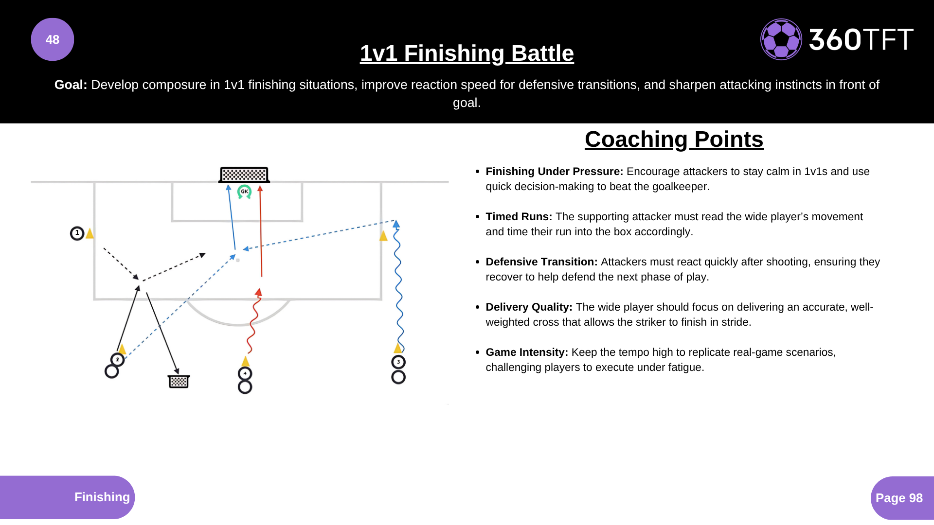 • Finishing Under Pressure: Encourage attackers to stay calm in 1v1s and use quick decision-making to beat the goalkeeper. • Timed Runs: The supporting attacker must read the wide player's movement and time their run into the box accordingly. • Defensive Transition: Attackers must react quickly after shooting, ensuring they recover to help defend the next phase of play. • Delivery Quality: The wide player should focus on delivering an accurate, well-weighted cross that allows the striker to finish in stride. • Game Intensity: Keep the tempo high to replicate real-game scenarios, challenging players to execute under fatigue.