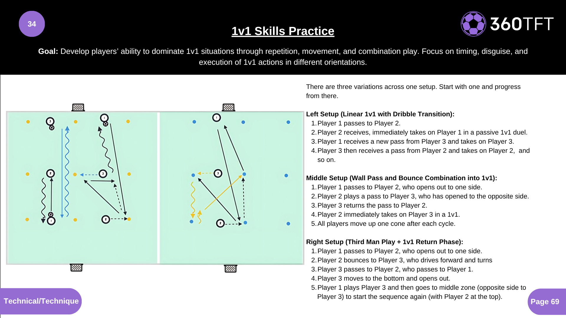 Develop players’ ability to dominate 1v1 situations through repetition, movement, and combination play. Focus on timing, disguise, and execution of 1v1 actions in different orientations.