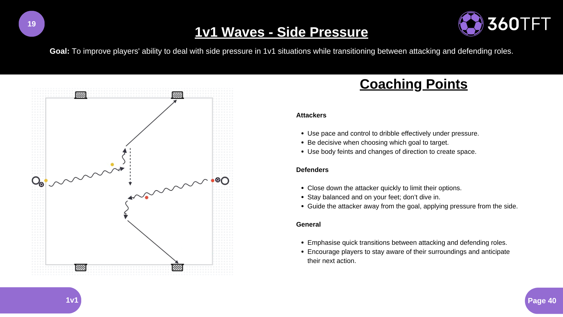 To improve players' ability to deal with side pressure in 1v1 situations while transitioning between attacking and defending roles.
