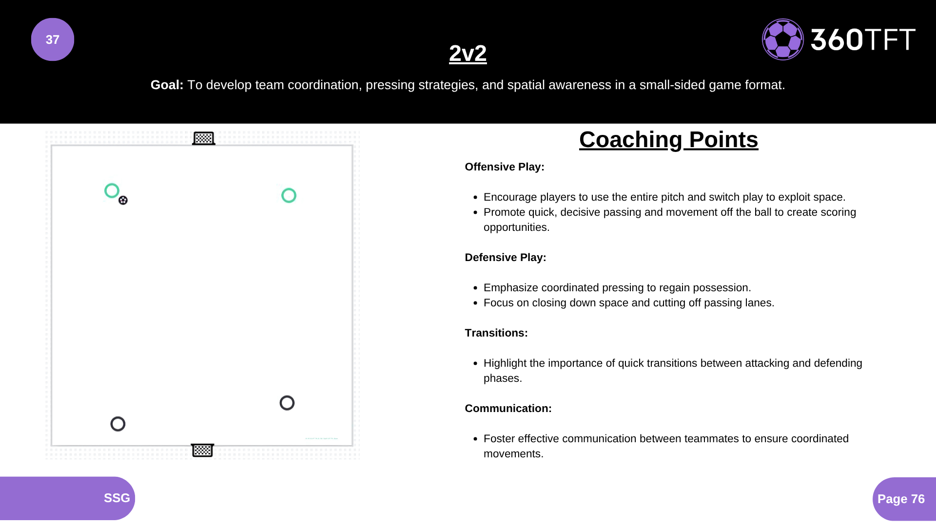 Offensive Play: • Encourage players to use the entire pitch and switch play to exploit space. • Promote quick, decisive passing and movement off the ball to create scoring opportunities. Defensive Play: • Emphasize coordinated pressing to regain possession. • Focus on closing down space and cutting off passing lanes. Transitions: • Highlight the importance of quick transitions between attacking and defending phases. Communication: • Foster effective communication between teammates to ensure coordinated movements.