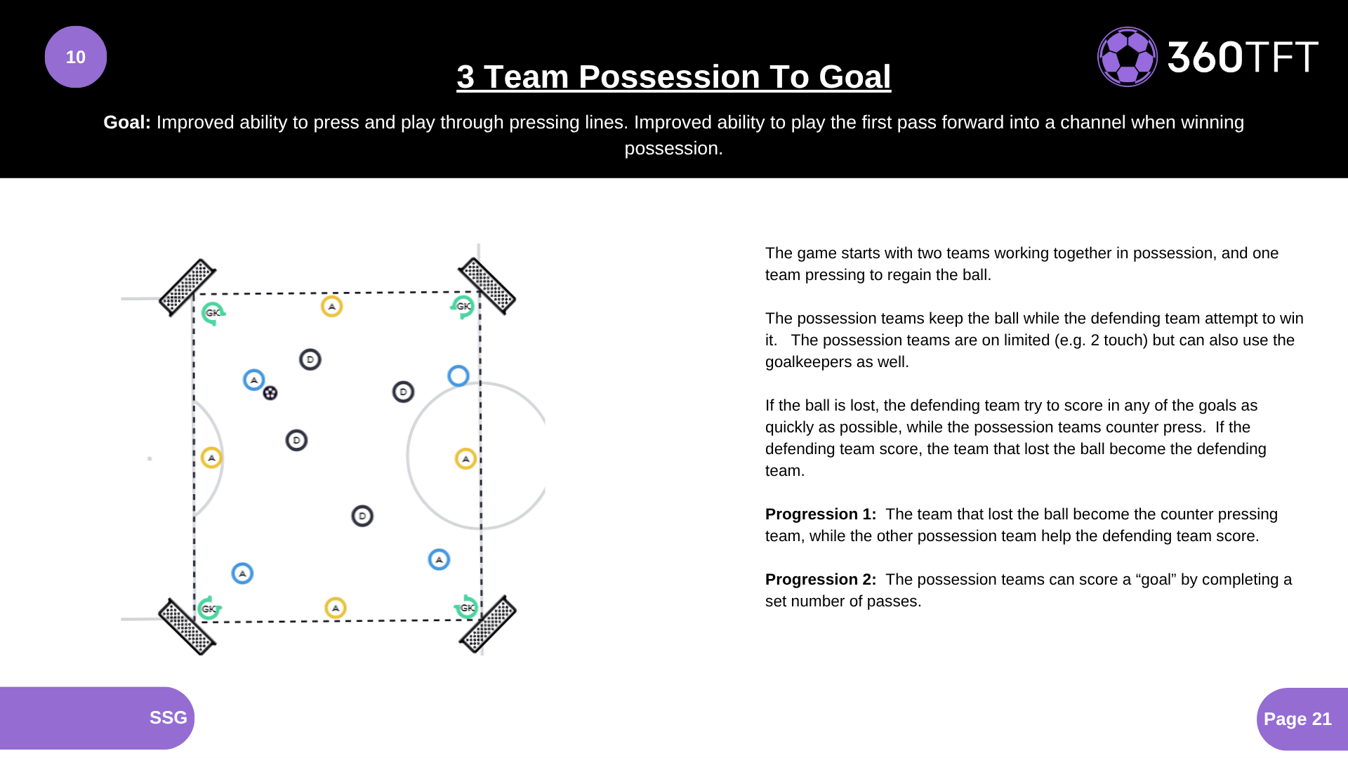 The game starts with two teams working together in possession, and one team pressing to regain the ball. The possession teams keep the ball while the defending team attempt to win it. The possession teams are on limited (e.g. 2 touch) but can also use the goalkeepers as well. If the ball is lost, the defending team try to score in any of the goals as quickly as possible, while the possession teams counter press. If the defending team score, the team that lost the ball become the defending team. Progression 1: The team that lost the ball become the counter pressing team, while the other possession team help the defending team score. Progression 2: The possession teams can score a “goal” by completing a set number of passes.