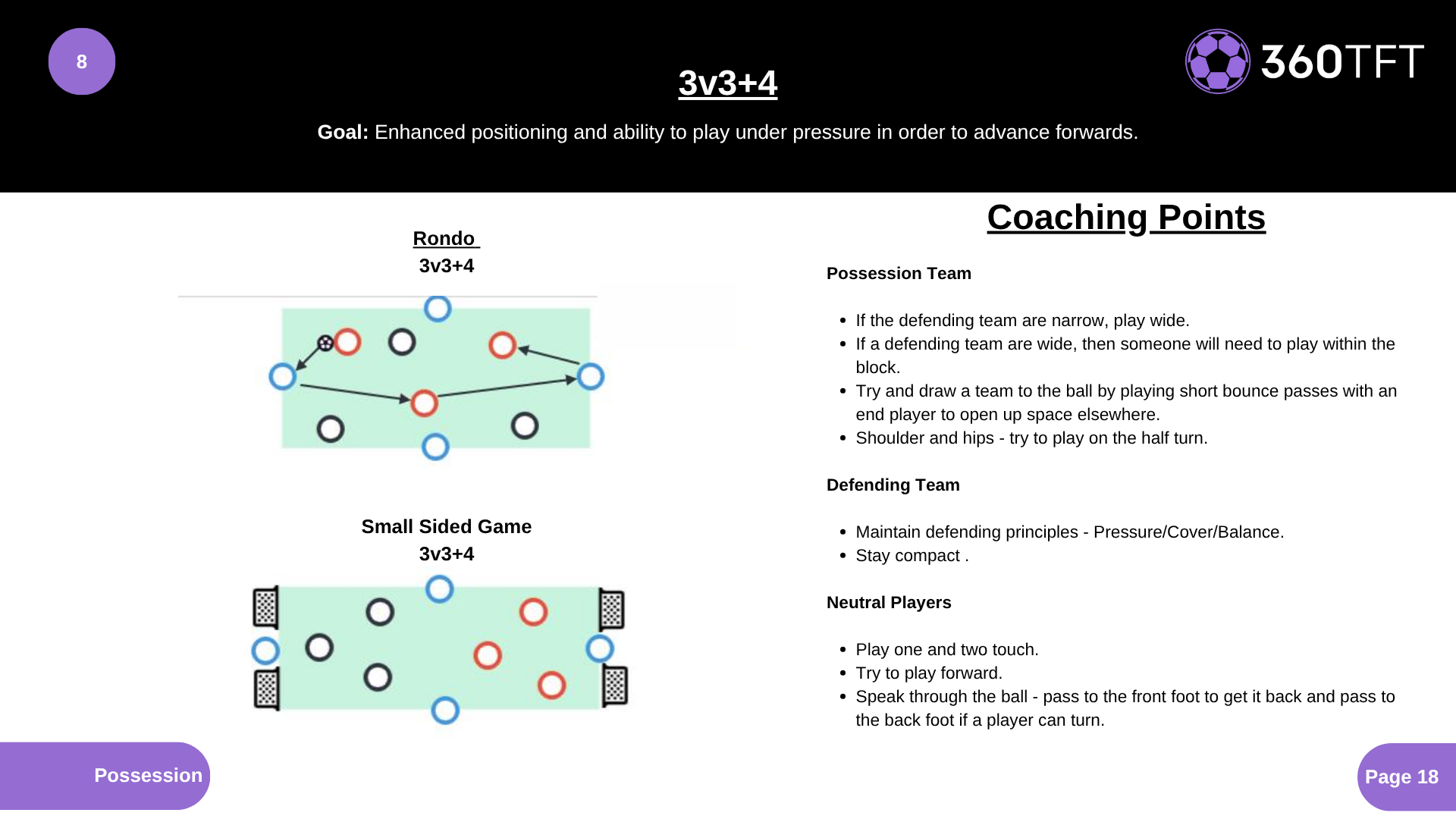 Possession Team • If the defending team are narrow, play wide. • If a defending team are wide, then someone will need to play within the block. • Try and draw a team to the ball by playing short bounce passes with an end player to open up space elsewhere. • Shoulder and hips - try to play on the half turn. Defending Team • Maintain defending principles - Pressure/Cover/Balance. • Stay compact. Neutral Players • Play one and two touch. • Try to play forward. • Speak through the ball - pass to the front foot to get it back and pass to the back foot if a player can turn.
