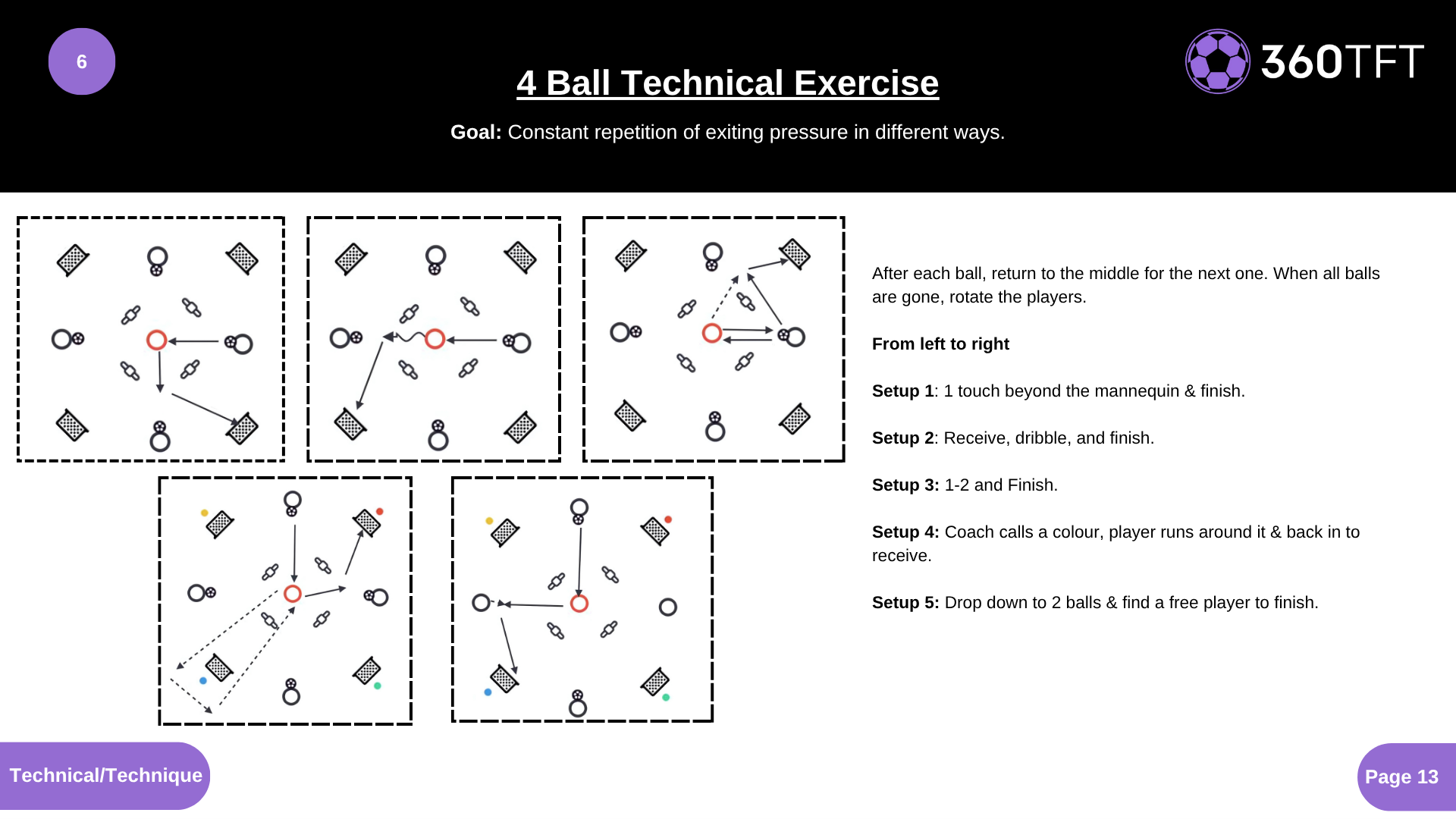 After each ball, return to the middle for the next one. When all balls are gone, rotate the players. From left to right Setup 1: 1 touch beyond the mannequin & finish. Setup 2: Receive, dribble, and finish. Setup 3: 1-2 and Finish. Setup 4: Coach calls a colour, player runs around it & back in to receive. Setup 5: Drop down to 2 balls & find a free player to finish.