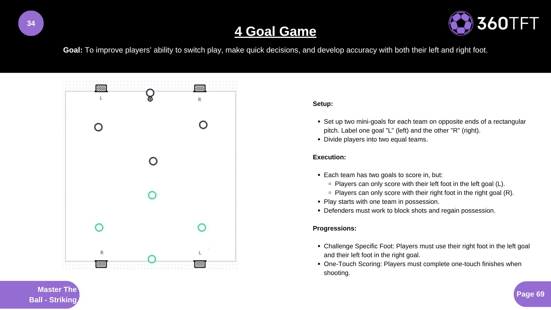 To improve players’ ability to switch play, make quick decisions, and develop accuracy with both their left and right foot.