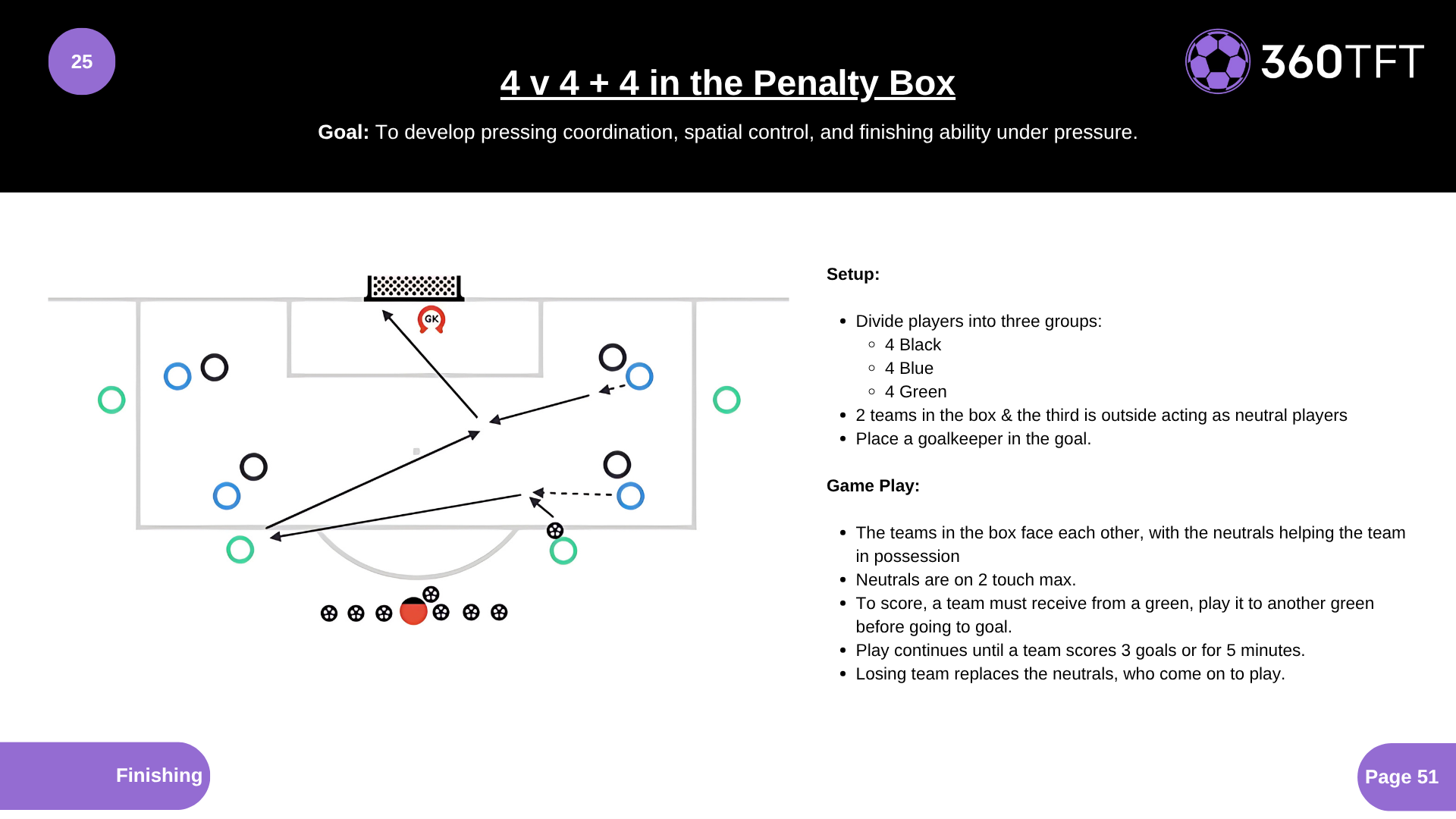 • Divide players into three groups: • 4 Black • 4 Blue • 4 Green • 2 teams in the box & the third is outside acting as neutral players • Place a goalkeeper in the goal. • The teams in the box face each other, with the neutrals helping the team in possession • Neutrals are on 2 touch max. • To score, a team must receive from a green, play it to another green before going to goal. • Play continues until a team scores 3 goals or for 5 minutes. • Losing team replaces the neutrals, who come on to play.