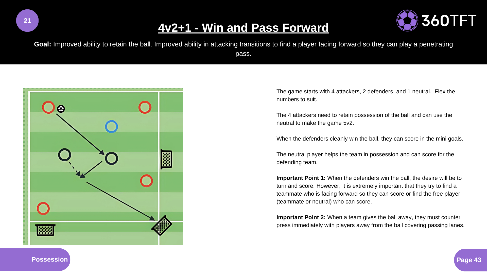 The game starts with 4 attackers, 2 defenders, and 1 neutral. Flex the numbers to suit. The 4 attackers need to retain possession of the ball and can use the neutral to make the game 5v2. When the defenders cleanly win the ball, they can score in the mini goals. The neutral player helps the team in possession and can score for the defending team. Important Point 1: When the defenders win the ball, the desire will be to turn and score. However, it is extremely important that they try to find a teammate who is facing forward so they can score or find the free player (teammate or neutral) who can score. Important Point 2: When a team gives the ball away, they must counter immediately with players away from the ball covering passing lanes.