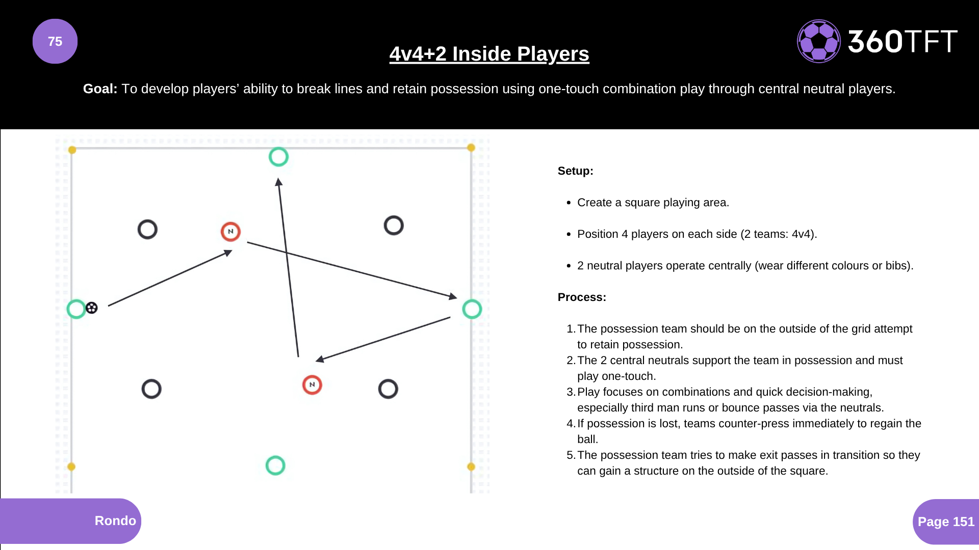 To develop players’ ability to break lines and retain possession using one-touch combination play through central neutral players.