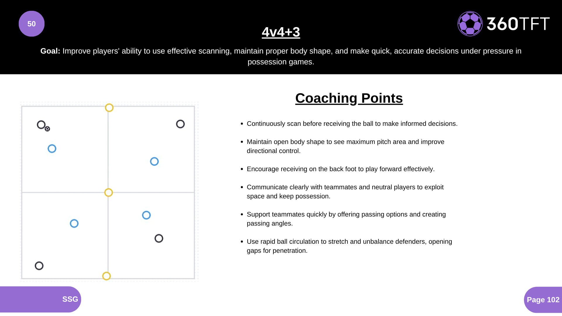 Improve players' ability to use effective scanning, maintain proper body shape, and make quick, accurate decisions under pressure in possession games.