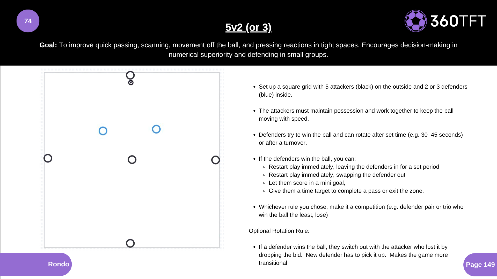 • Set up a square grid with 5 attackers (black) on the outside and 2 or 3 defenders (blue) inside. • The attackers must maintain possession and work together to keep the ball moving with speed. • Defenders try to win the ball and can rotate after set time (e.g. 30–45 seconds). • If the defenders win the ball, you can: • Restart play immediately, leaving the defenders in for a set period. • Restart play immediately, swapping the defender out. • Let them score in a mini goal. • Give them a time target to complete a pass or exit the zone. • Whichever rule you chose, make it a competition (e.g. defender pair or trio who win the ball the least, lose). • Optional Rotation Rule: • If a defender wins the ball, they switch out with the attacker who lost it by dropping the bid. New defender has to pick it up. Makes the game more transitional.
