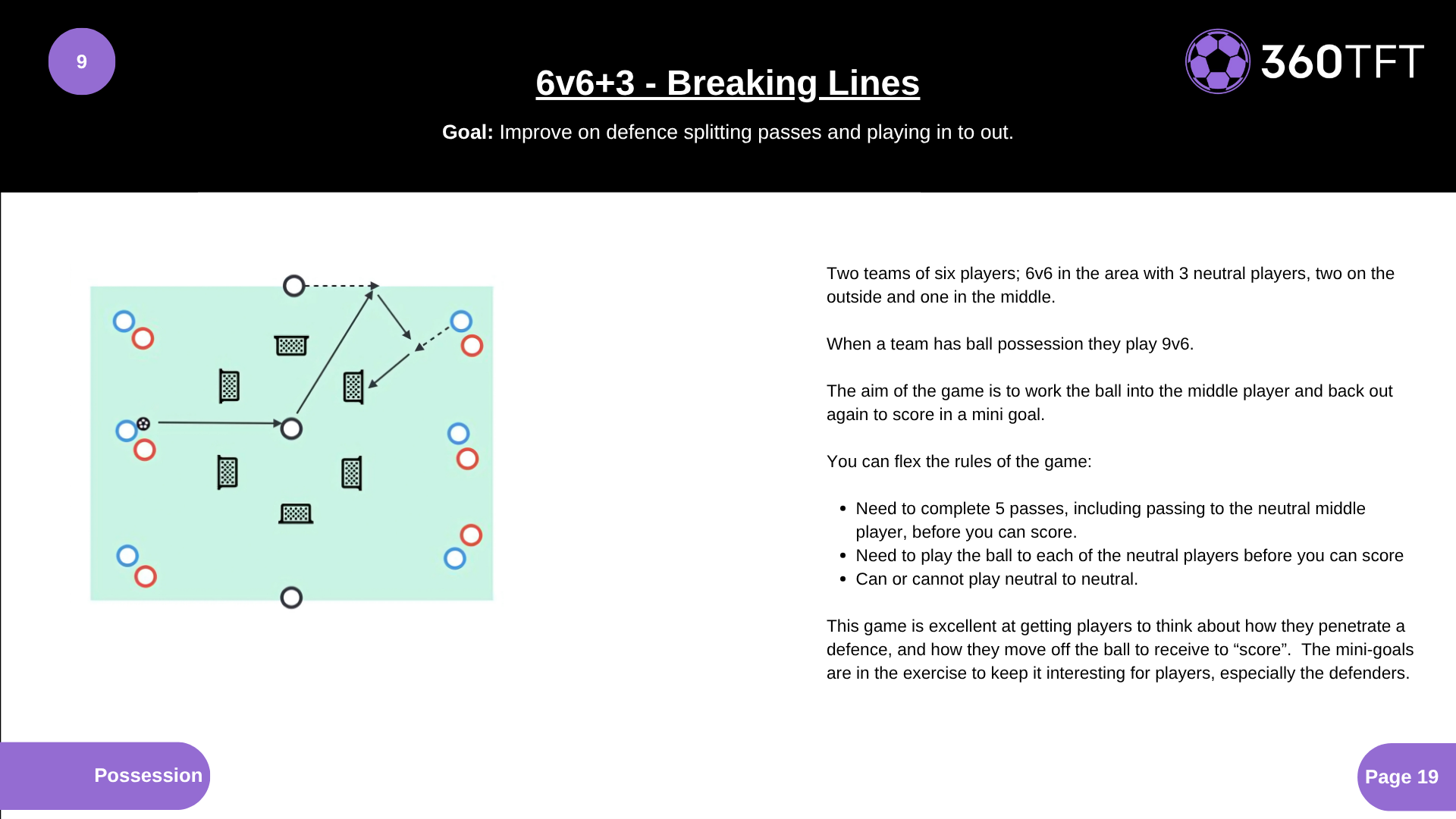Two teams of six players; 6v6 in the area with 3 neutral players, two on the outside and one in the middle. When a team has ball possession they play 9v6. The aim of the game is to work the ball into the middle player and back out again to score in a mini goal. You can flex the rules of the game: - Need to complete 5 passes, including passing to the neutral middle player, before you can score. - Need to play the ball to each of the neutral players before you can score. - Can or cannot play neutral to neutral. This game is excellent at getting players to think about how they penetrate a defence, and how they move off the ball to receive to “score”. The mini-goals are in the exercise to keep it interesting for players, especially the defenders.