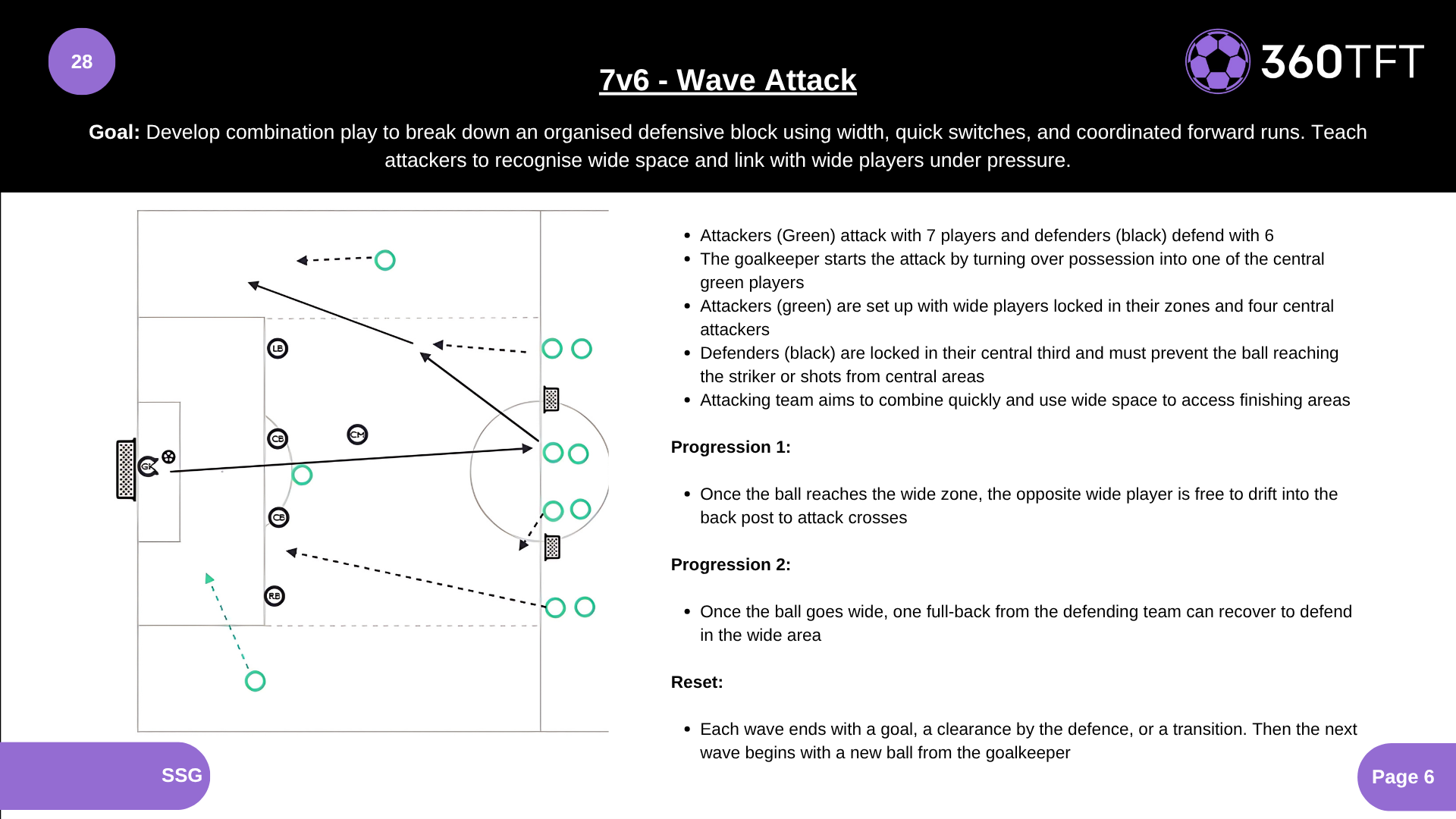 • Attackers (Green) attack with 7 players and defenders (black) defend with 6 • The goalkeeper starts the attack by turning over possession into one of the central green players • Attackers (green) are set up with wide players locked in their zones and four central attackers • Defenders (black) are locked in their central third and must prevent the ball reaching the striker or shots from central areas • Attacking team aims to combine quickly and use wide space to access finishing areas Progression 1: • Once the ball reaches the wide zone, the opposite wide player is free to drift into the back post to attack crosses Progression 2: • Once the ball goes wide, one full-back from the defending team can recover to defend in the wide area Reset: • Each wave ends with a goal, a clearance by the defence, or a transition. Then the next wave begins with a new ball from the goalkeeper.