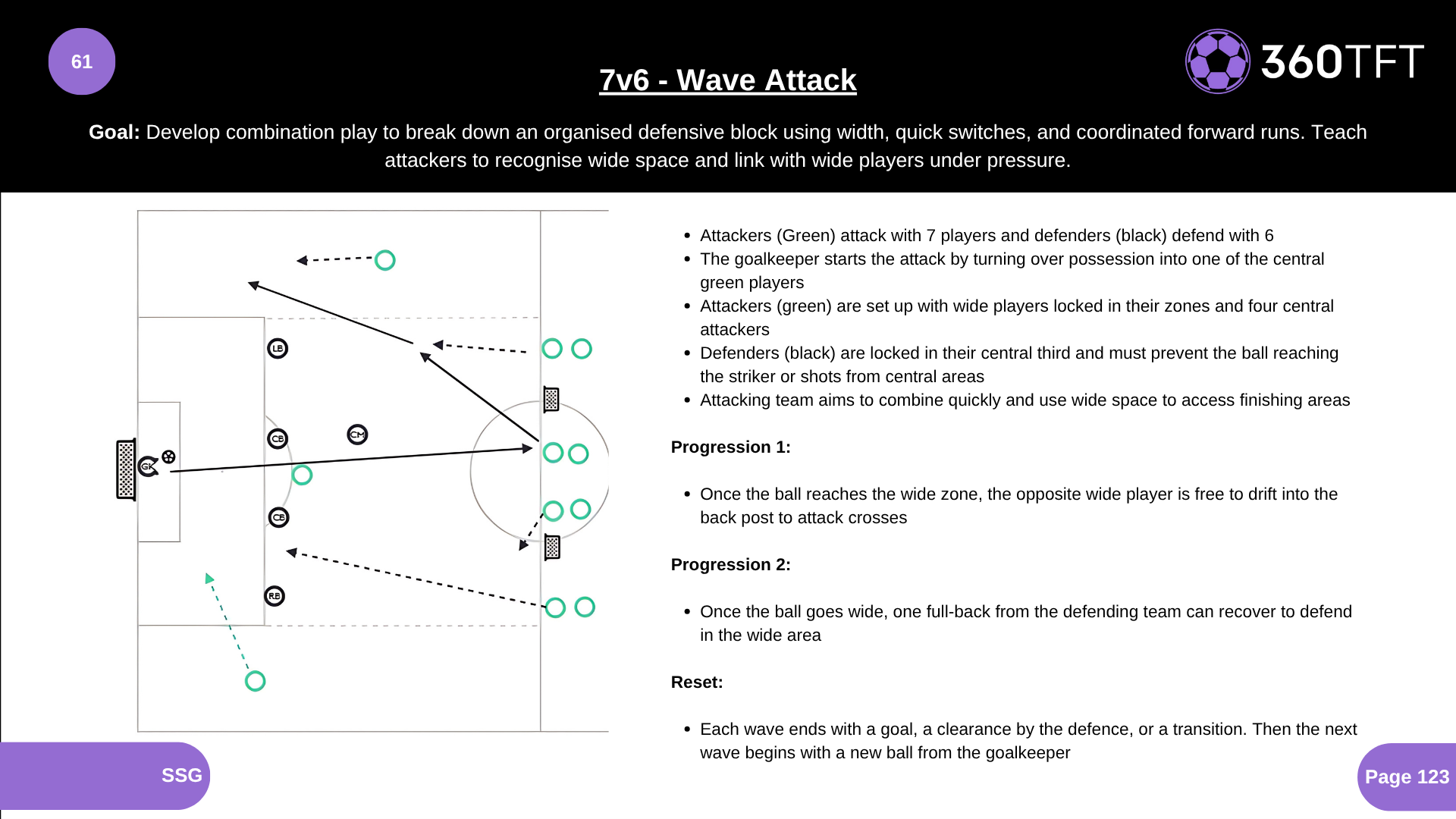 • Attackers (Green) attack with 7 players and defenders (black) defend with 6 • The goalkeeper starts the attack by turning over possession into one of the central green players • Attackers (green) are set up with wide players locked in their zones and four central attackers • Defenders (black) are locked in their central third and must prevent the ball reaching the striker or shots from central areas • Attacking team aims to combine quickly and use wide space to access finishing areas Progression 1: • Once the ball reaches the wide zone, the opposite wide player is free to drift into the back post to attack crosses Progression 2: • Once the ball goes wide, one full-back from the defending team can recover to defend in the wide area Reset: • Each wave ends with a goal, a clearance by the defence, or a transition. Then the next wave begins with a new ball from the goalkeeper