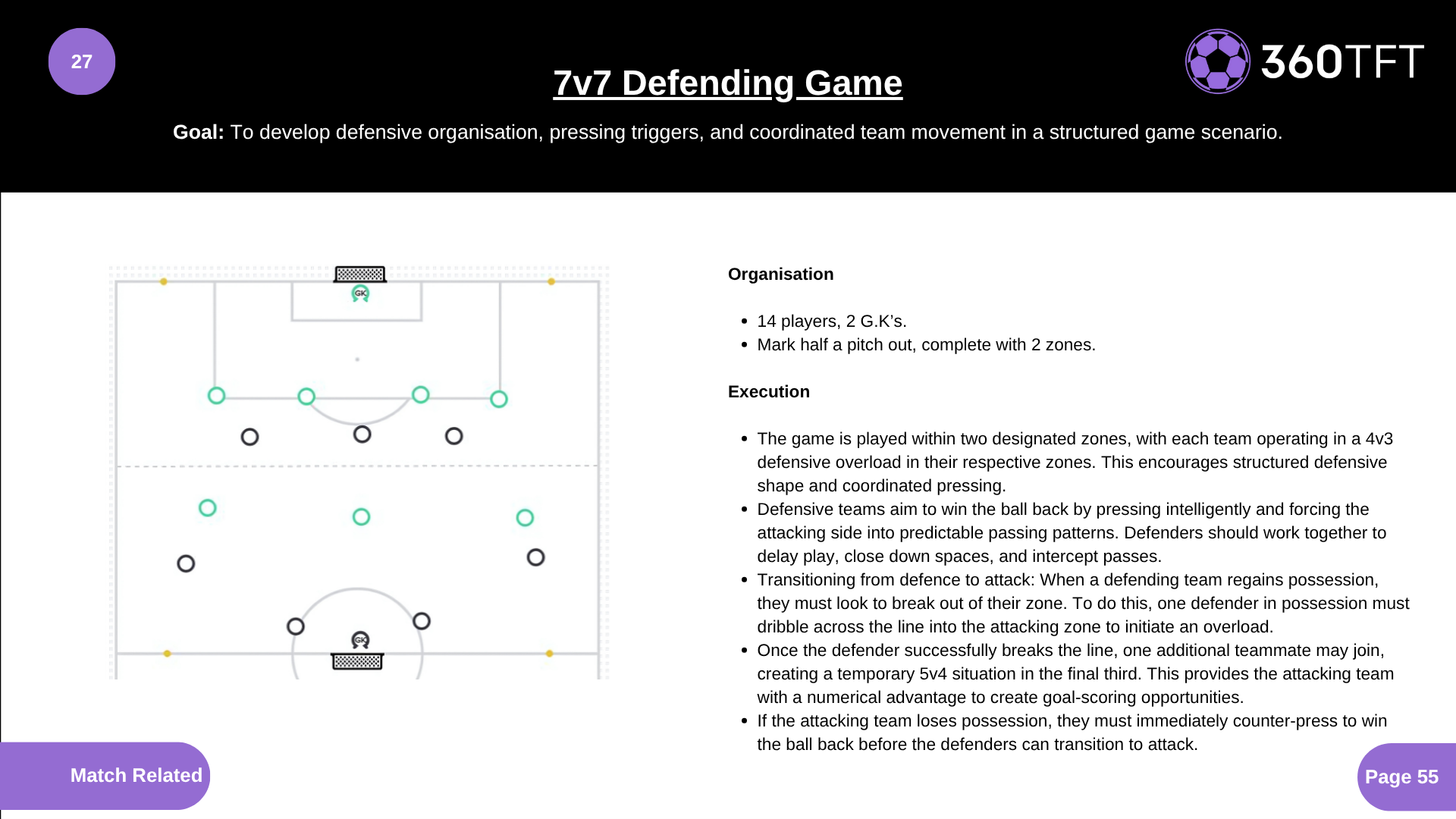 • 14 players, 2 G.K.’s. • Mark half a pitch out, complete with 2 zones. • The game is played within two designated zones, with each team operating in a 4v3 defensive overload in their respective zones. This encourages structured defensive shape and coordinated pressing. • Defensive teams aim to win the ball back by pressing intelligently and forcing the attacking side into predictable passing patterns. Defenders should work together to delay play, close down spaces, and intercept passes. • Transitioning from defence to attack: When a defending team regains possession, they must look to break out of their zone. To do this, one defender in possession must dribble across the line into the attacking zone to initiate an overload. • Once the defender successfully breaks the line, one additional teammate may join, creating a temporary 5v4 situation in the final third. This provides the attacking team with a numerical advantage to create goal-scoring opportunities. • If the attacking team loses possession, they must immediately counter-press to win the ball back before the defenders can transition to attack.