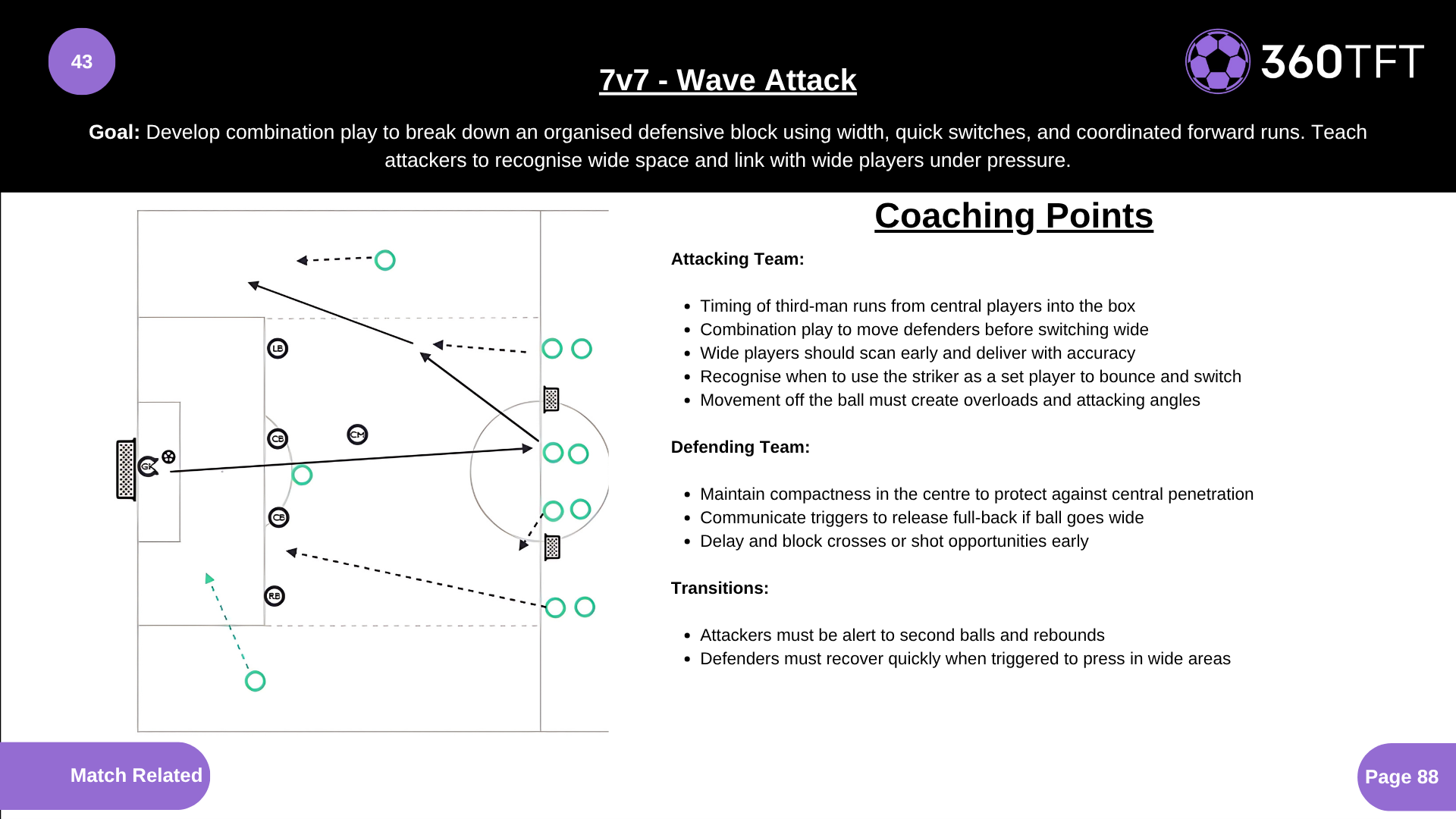 Develop combination play to break down an organised defensive block using width, quick switches, and coordinated forward runs. Teach attackers to recognise wide space and link with wide players under pressure.