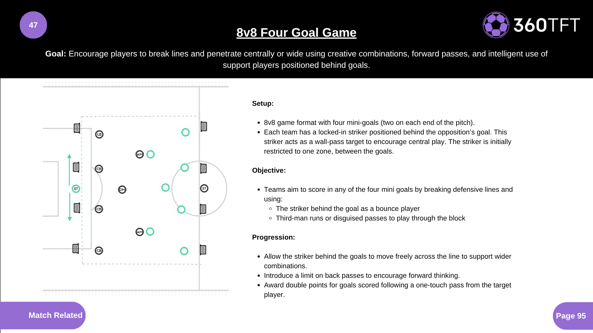 8v8 game format with four mini-goals (two on each end of the pitch). Each team has a locked-in striker positioned behind the opposition’s goal. This striker acts as a wall-pass target to encourage central play. The striker is initially restricted to one zone, between the goals. Teams aim to score in any of the four mini goals by breaking defensive lines and using: - The striker behind the goal as a bounce player - Third-man runs or disguised passes to play through the block. Allow the striker behind the goals to move freely across the line to support wider combinations. Introduce a limit on back passes to encourage forward thinking. Award double points for goals scored following a one-touch pass from the target player.