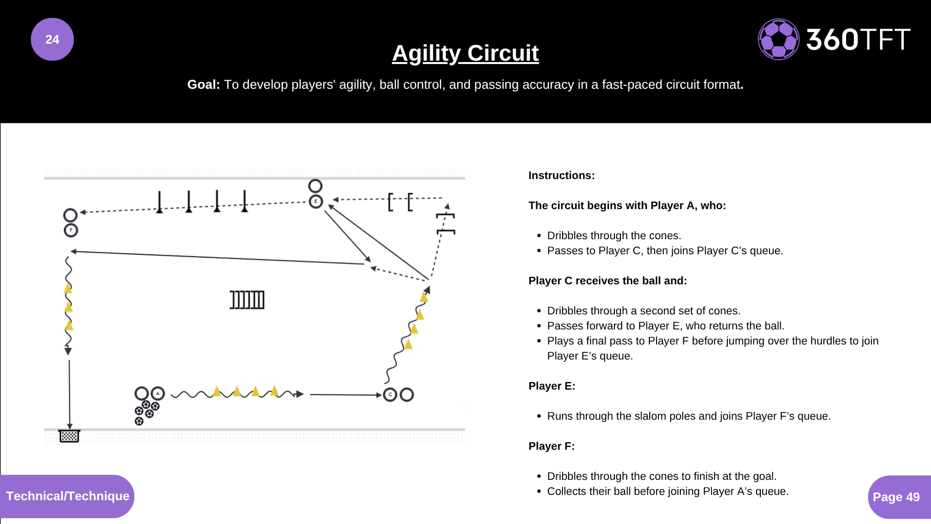 The circuit begins with Player A, who: • Dribbles through the cones. • Passes to Player C, then joins Player C’s queue. Player C receives the ball and: • Dribbles through a second set of cones. • Passes forward to Player E, who returns the ball. • Plays a final pass to Player F before jumping over the hurdles to join Player E’s queue. Player E: • Runs through the slalom poles and joins Player F’s queue. Player F: • Dribbles through the cones to finish at the goal. • Collects their ball before joining Player A’s queue.