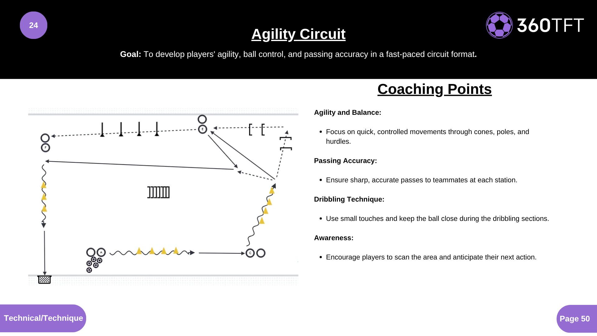 • Agility and Balance: • • Focus on quick, controlled movements through cones, poles, and hurdles. • Passing Accuracy: • • Ensure sharp, accurate passes to teammates at each station. • Dribbling Technique: • • Use small touches and keep the ball close during the dribbling sections. • Awareness: • • Encourage players to scan the area and anticipate their next action.