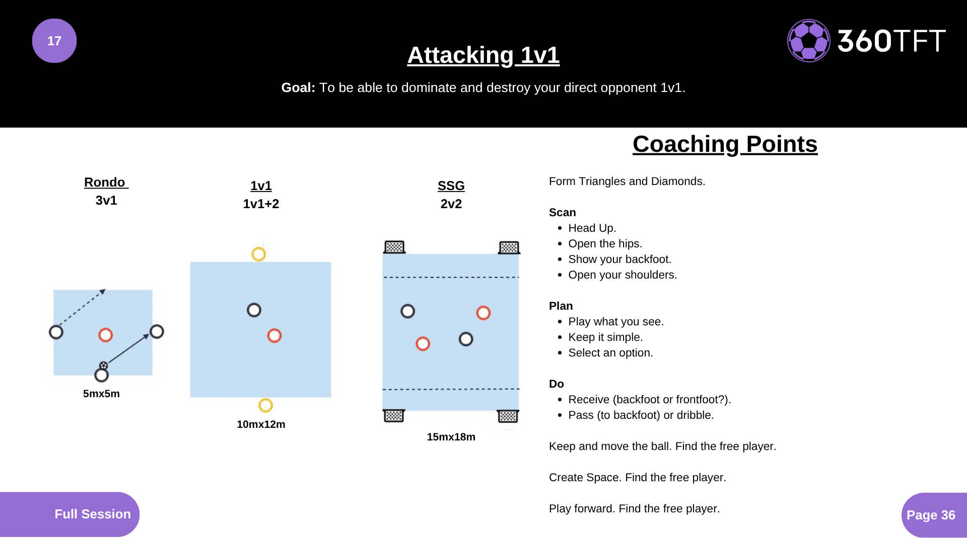 Form Triangles and Diamonds. Scan • Head Up. • Open the hips. • Show your backfoot. • Open your shoulders. Plan • Play what you see. • Keep it simple. • Select an option. Do • Receive (backfoot or frontfoot?). • Pass (to backfoot) or dribble. Keep and move the ball. Find the free player. Create Space. Find the free player. Play forward. Find the free player.