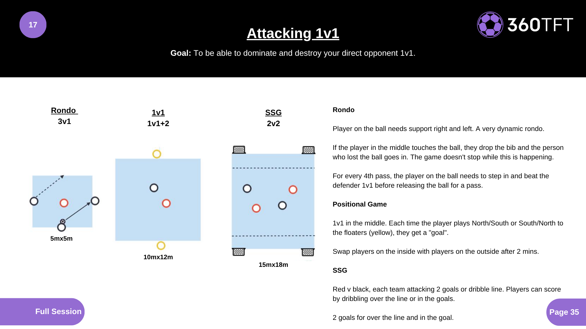 Rondo Player on the ball needs support right and left. A very dynamic rondo. If the player in the middle touches the ball, they drop the bib and the person who lost the ball goes in. The game doesn't stop while this is happening. For every 4th pass, the player on the ball needs to step in and beat the defender 1v1 before releasing the ball for a pass. Positional Game 1v1 in the middle. Each time the player plays North/South or South/North to the floaters (yellow), they get a "goal". Swap players on the inside with players on the outside after 2 mins. SSG Red v black, each team attacking 2 goals or dribble line. Players can score by dribbling over the line or in the goals. 2 goals for over the line and in the goal.