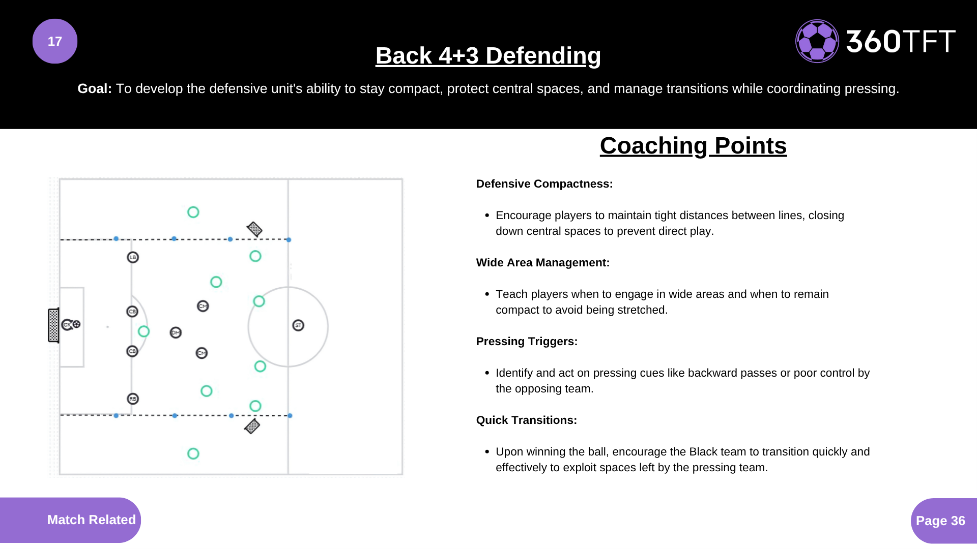 Defensive Compactness: • Encourage players to maintain tight distances between lines, closing down central spaces to prevent direct play. Wide Area Management: • Teach players when to engage in wide areas and when to remain compact to avoid being stretched. Pressing Triggers: • Identify and act on pressing cues like backward passes or poor control by the opposing team. Quick Transitions: • Upon winning the ball, encourage the Black team to transition quickly and effectively to exploit spaces left by the pressing team.