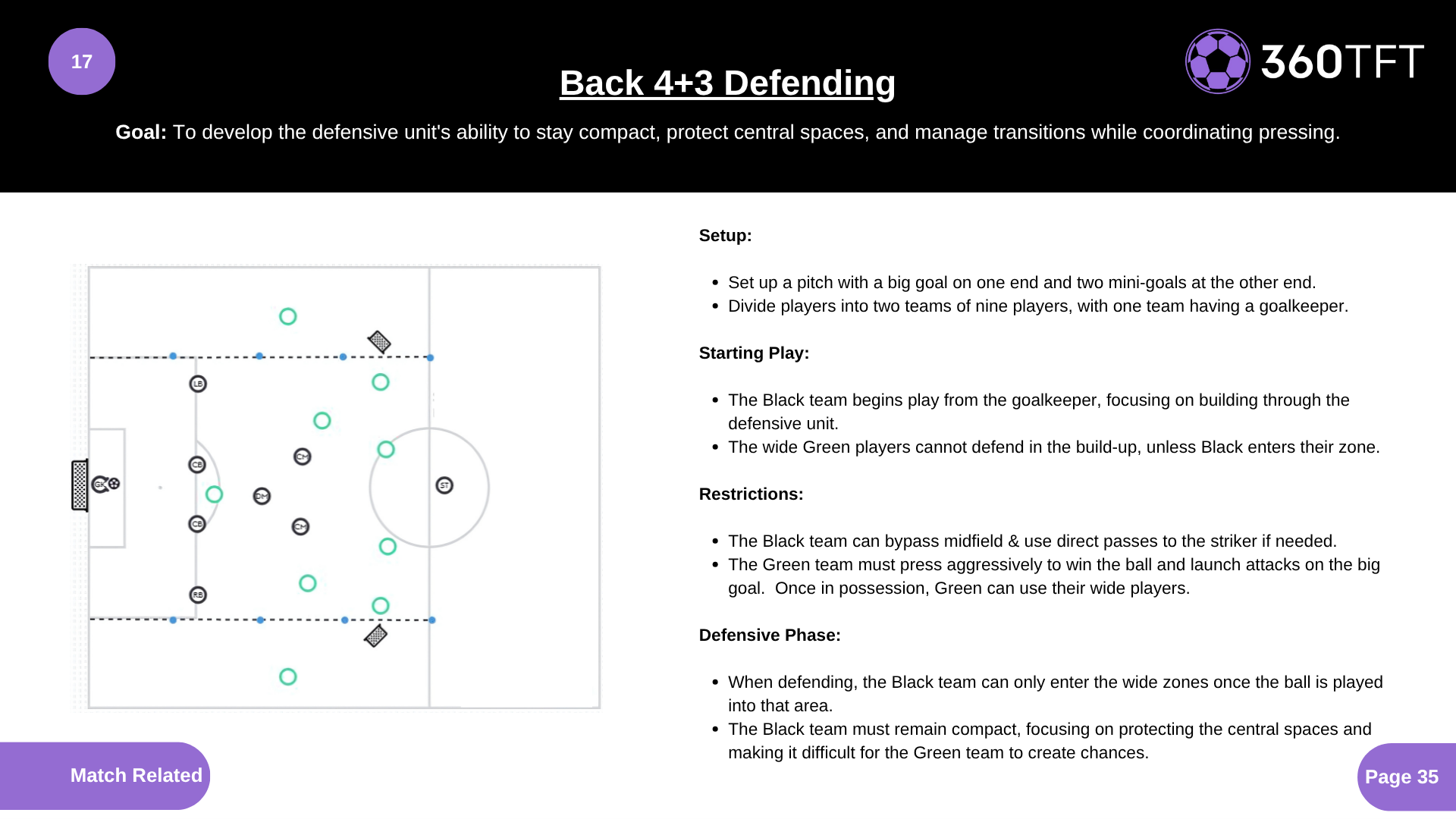 • Set up a pitch with a big goal on one end and two mini-goals at the other end. • Divide players into two teams of nine players, with one team having a goalkeeper. • The Black team begins play from the goalkeeper, focusing on building through the defensive unit. • The wide Green players cannot defend in the build-up, unless Black enters their zone. • The Black team can bypass midfield & use direct passes to the striker if needed. • The Green team must press aggressively to win the ball and launch attacks on the big goal. Once in possession, Green can use their wide players. • When defending, the Black team can only enter the wide zones once the ball is played into that area. • The Black team must remain compact, focusing on protecting the central spaces and making it difficult for the Green team to create chances.