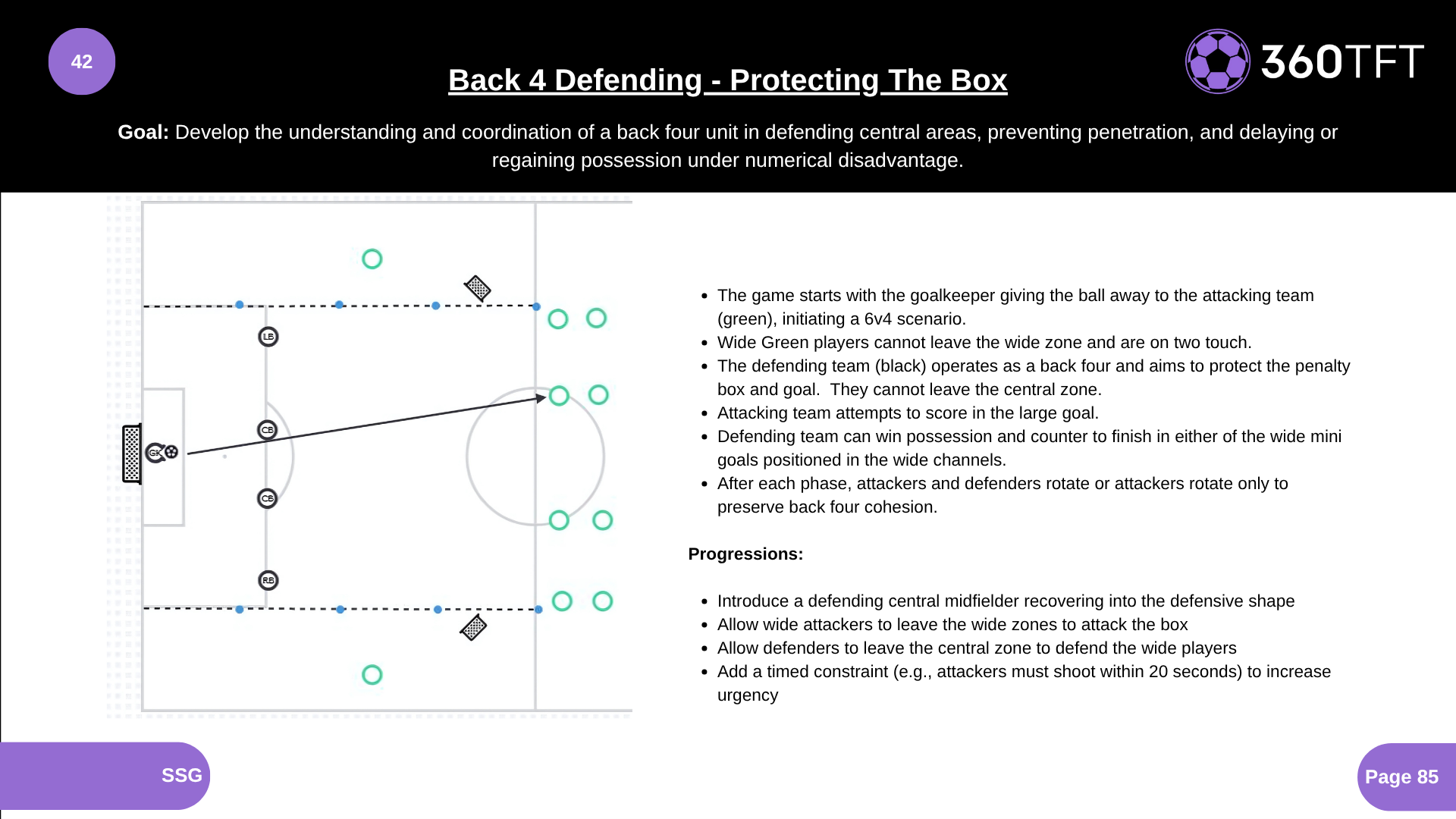 - The game starts with the goalkeeper giving the ball away to the attacking team (green), initiating a 6v4 scenario. - Wide Green players cannot leave the wide zone and are on two touch. - The defending team (black) operates as a back four and aims to protect the penalty box and goal. They cannot leave the central zone. - Attacking team attempts to score in the large goal. - Defending team can win possession and counter to finish in either of the wide mini goals positioned in the wide channels. - After each phase, attackers and defenders rotate or attackers rotate only to preserve back four cohesion.