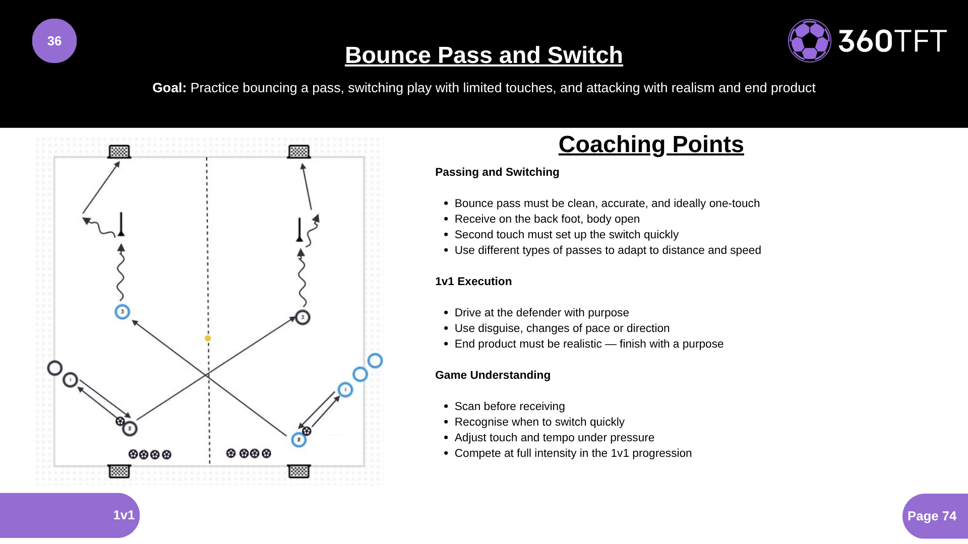 • Bounce pass must be clean, accurate, and ideally one-touch • Receive on the back foot, body open • Second touch must set up the switch quickly • Use different types of passes to adapt to distance and speed 1v1 Execution • Drive at the defender with purpose • Use disguise, changes of pace or direction • End product must be realistic — finish with a purpose Game Understanding • Scan before receiving • Recognise when to switch quickly • Adjust touch and tempo under pressure • Compete at full intensity in the 1v1 progression