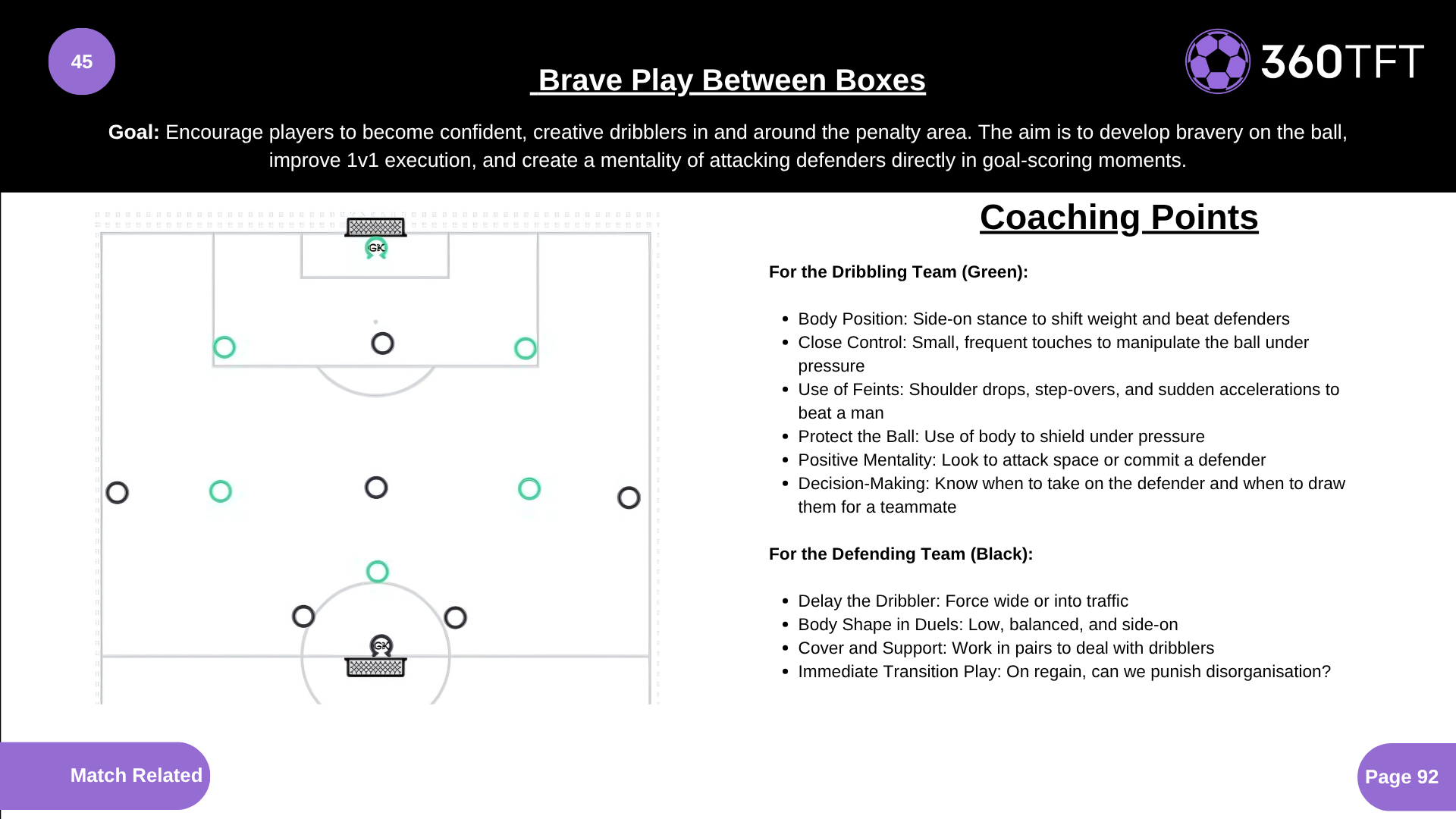 For the Dribbling Team (Green): - Body Position: Side-on stance to shift weight and beat defenders - Close Control: Small, frequent touches to manipulate the ball under pressure - Use of Feints: Shoulder drops, step-overs, and sudden accelerations to beat a man - Protect the Ball: Use of body to shield under pressure - Positive Mentality: Look to attack space or commit a defender - Decision-Making: Know when to take on the defender and when to draw them for a teammate For the Defending Team (Black): - Delay the Dribbler: Force wide or into traffic - Body Shape in Duels: Low, balanced, and side-on - Cover and Support: Work in pairs to deal with dribblers - Immediate Transition Play: On regain, can we punish disorganisation?