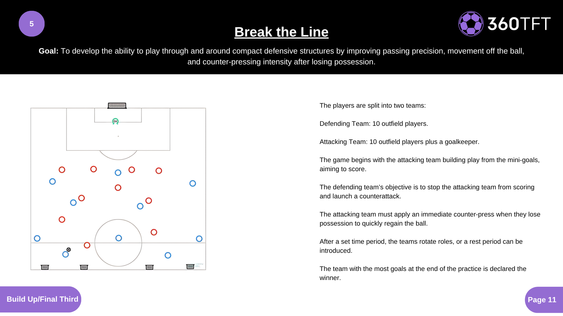 The players are split into two teams: Defending Team: 10 outfield players. Attacking Team: 10 outfield players plus a goalkeeper. The game begins with the attacking team building play from the mini-goals, aiming to score. The defending team’s objective is to stop the attacking team from scoring and launch a counterattack. The attacking team must apply an immediate counter-press when they lose possession to quickly regain the ball. After a set time period, the teams rotate roles, or a rest period can be introduced. The team with the most goals at the end of the practice is declared the winner.