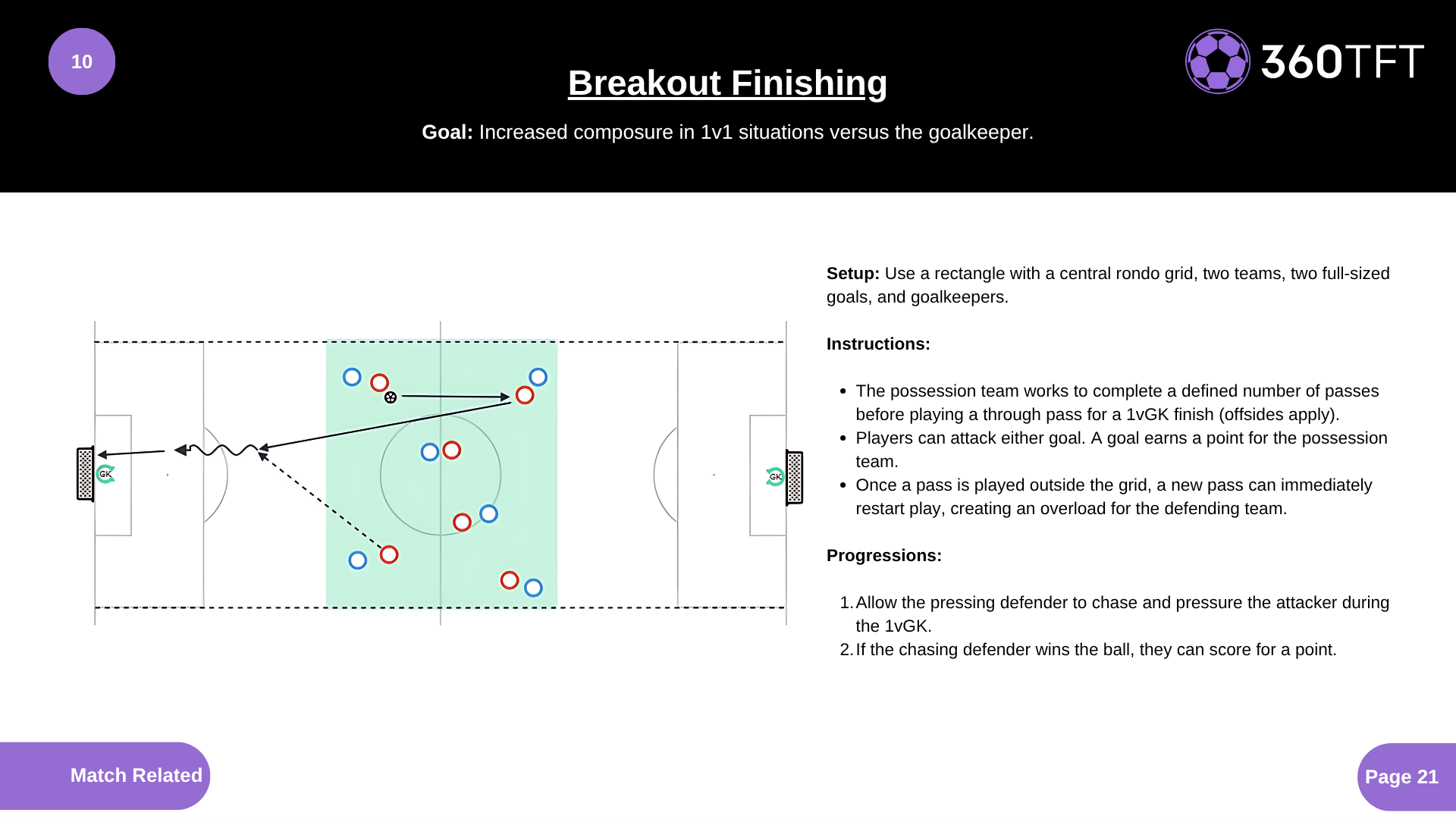 • The possession team works to complete a defined number of passes before playing a through pass for a 1vGK finish (offsides apply). • Players can attack either goal. A goal earns a point for the possession team. • Once a pass is played outside the grid, a new pass can immediately restart play, creating an overload for the defending team.