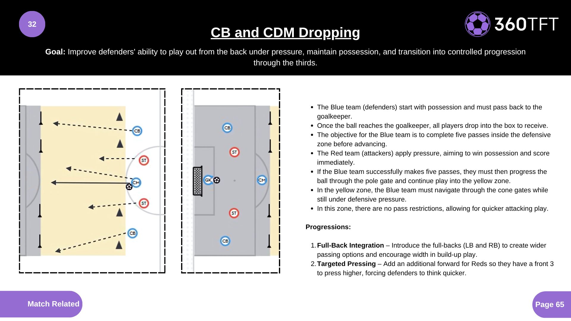 Improve defenders' ability to play out from the back under pressure, maintain possession, and transition into controlled progression through the thirds.