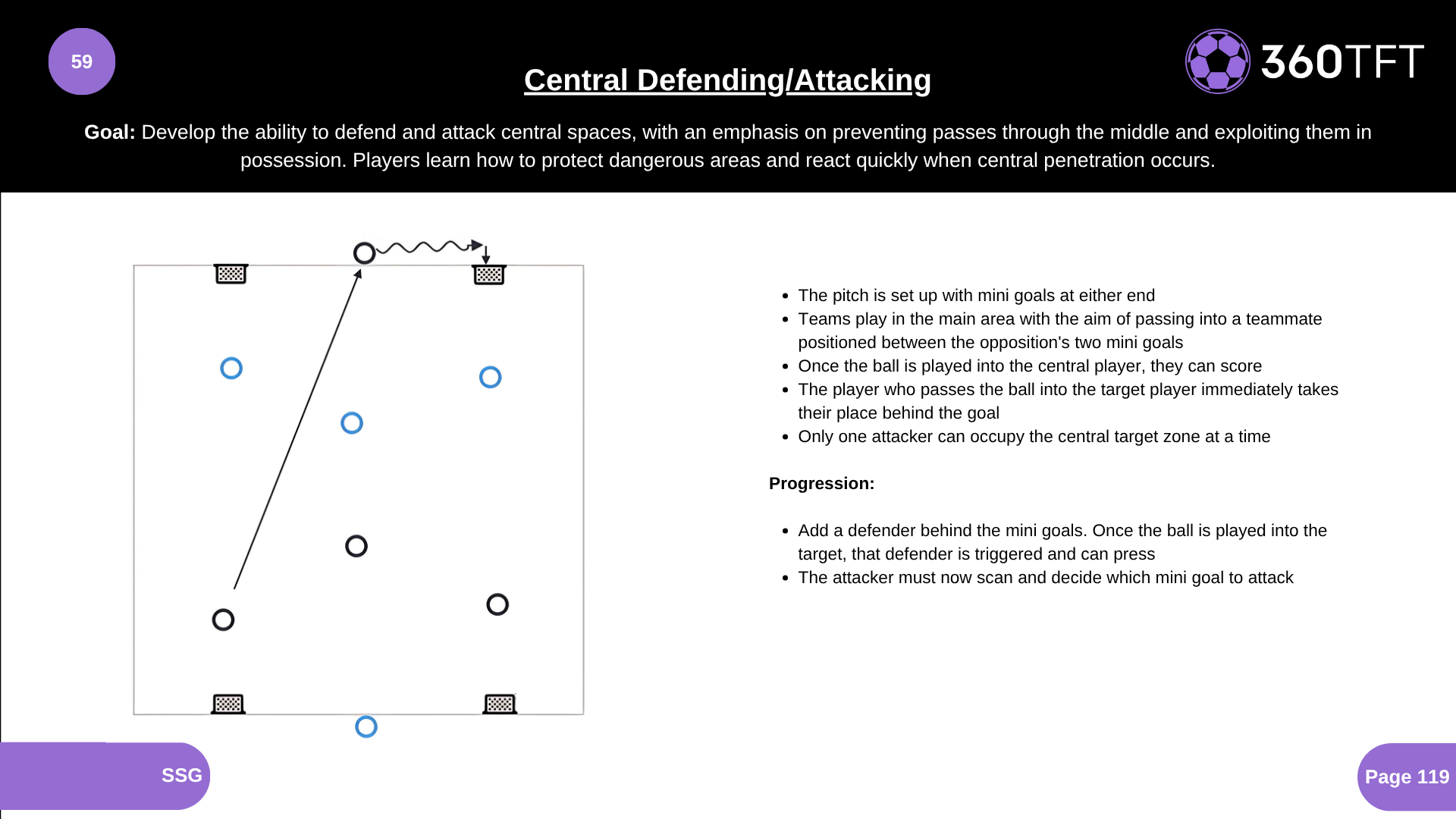 The pitch is set up with mini goals at either end Teams play in the main area with the aim of passing into a teammate positioned between the opposition's two mini goals Once the ball is played into the central player, they can score The player who passes the ball into the target player immediately takes their place behind the goal Only one attacker can occupy the central target zone at a time Progression: Add a defender behind the mini goals. Once the ball is played into the target, that defender is triggered and can press The attacker must now scan and decide which mini goal to attack