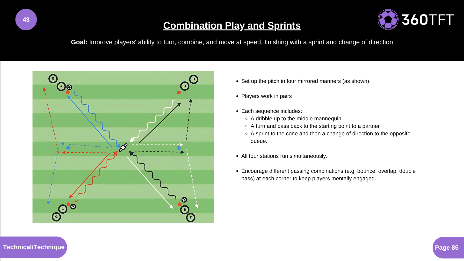 Improve players' ability to turn, combine, and move at speed, finishing with a sprint and change of direction
