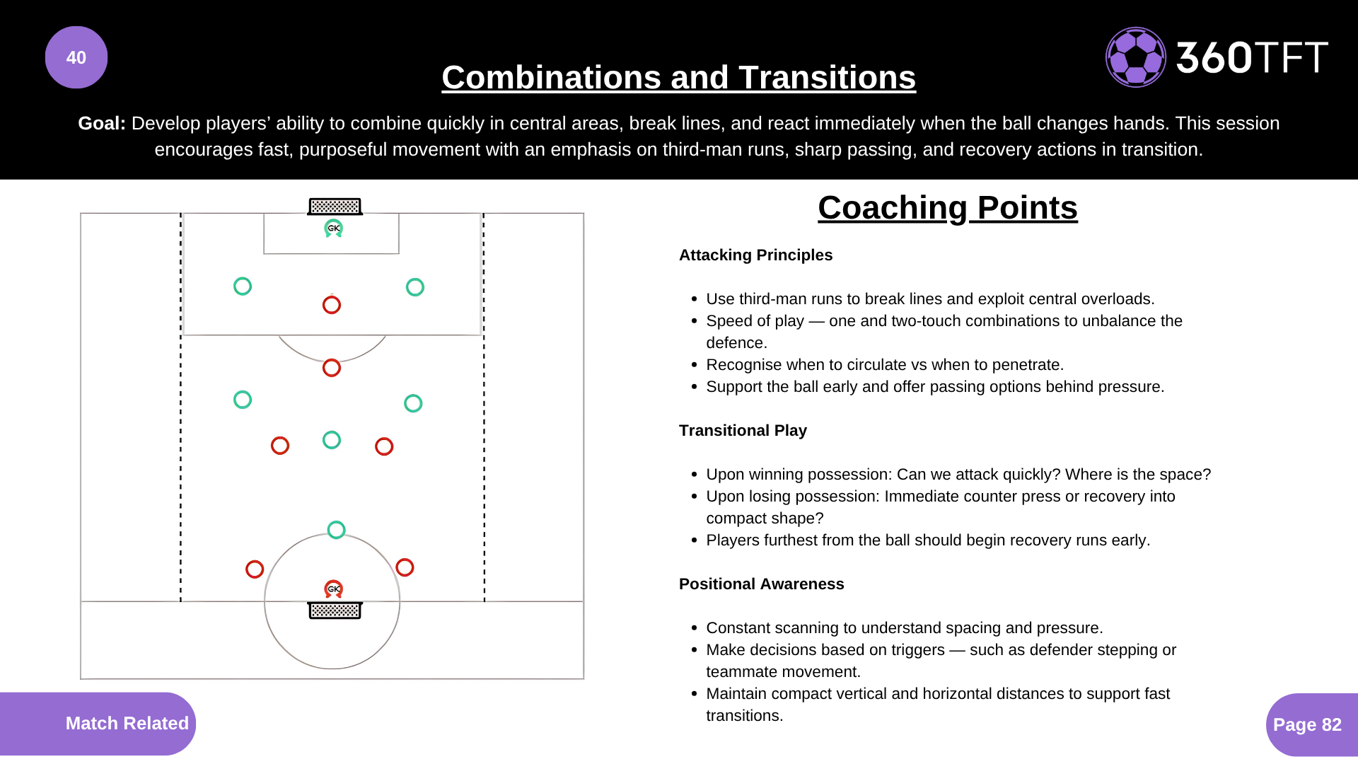 Attacking Principles • Use third-man runs to break lines and exploit central overloads. • Speed of play — one and two-touch combinations to unbalance the defence. • Recognise when to circulate vs when to penetrate. • Support the ball early and offer passing options behind pressure. Transitional Play • Upon winning possession: Can we attack quickly? Where is the space? • Upon losing possession: Immediate counter press or recovery into compact shape? • Players furthest from the ball should begin recovery runs early. Positional Awareness • Constant scanning to understand spacing and pressure. • Make decisions based on triggers — such as defender stepping or teammate movement. • Maintain compact vertical and horizontal distances to support fast transitions.