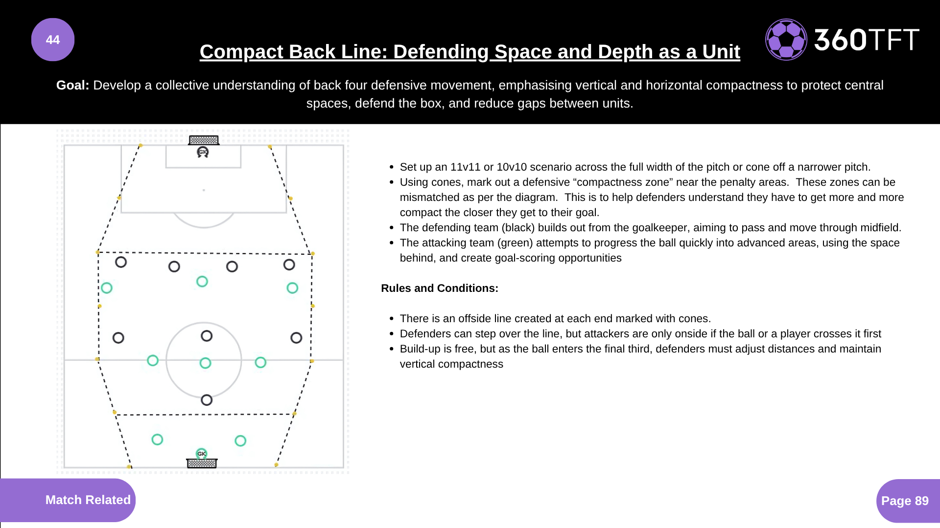 • Set up an 11v11 or 10v10 scenario across the full width of the pitch or cone off a narrower pitch. • Using cones, mark out a defensive “compactness zone” near the penalty areas. These zones can be mismatched as per the diagram. This is to help defenders understand they have to get more and more compact the closer they get to their goal. • The defending team (black) builds out from the goalkeeper, aiming to pass and move through midfield. • The attacking team (green) attempts to progress the ball quickly into advanced areas, using the space behind, and create goal-scoring opportunities