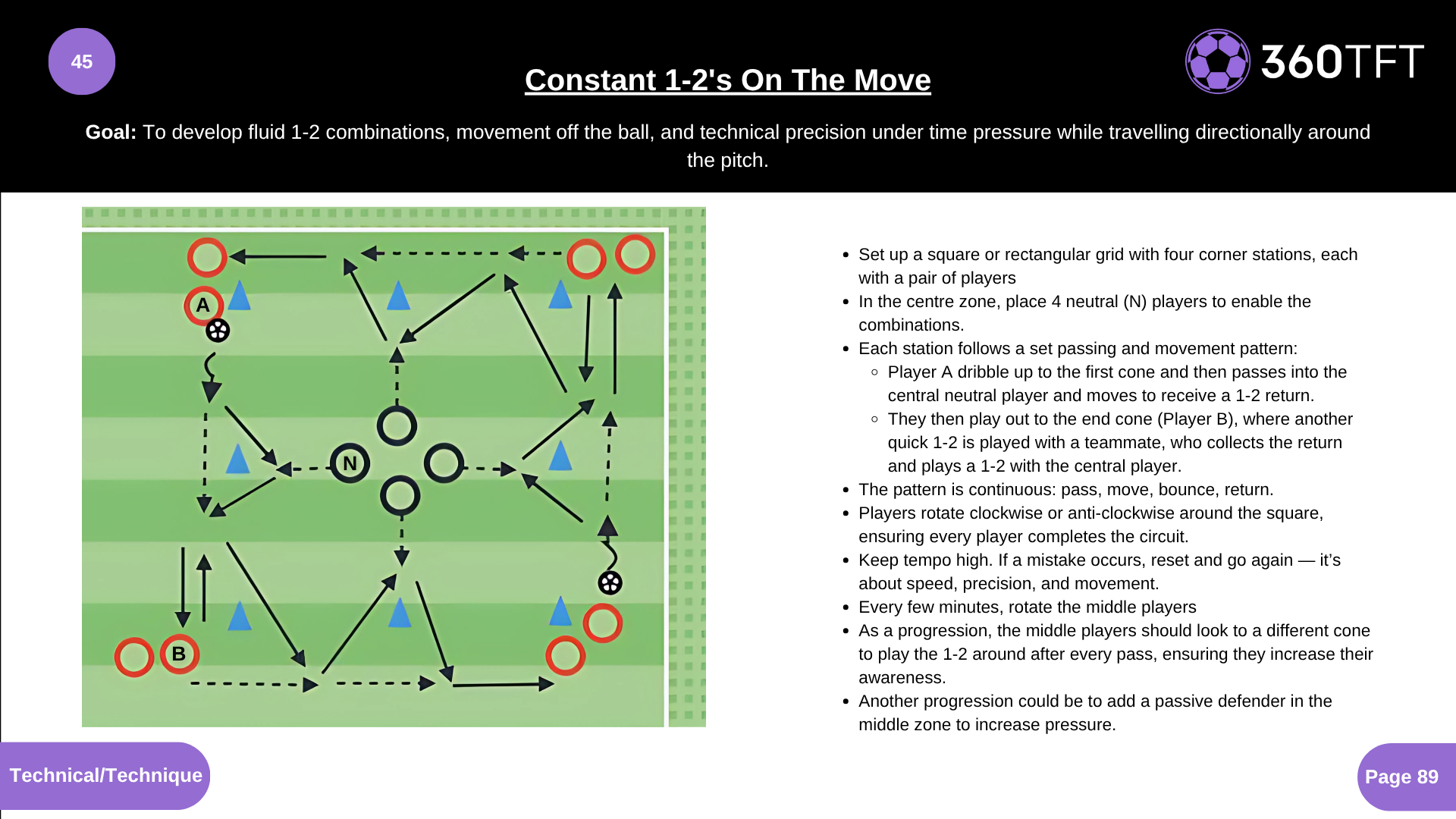 To develop fluid 1-2 combinations, movement off the ball, and technical precision under time pressure while travelling directionally around the pitch.