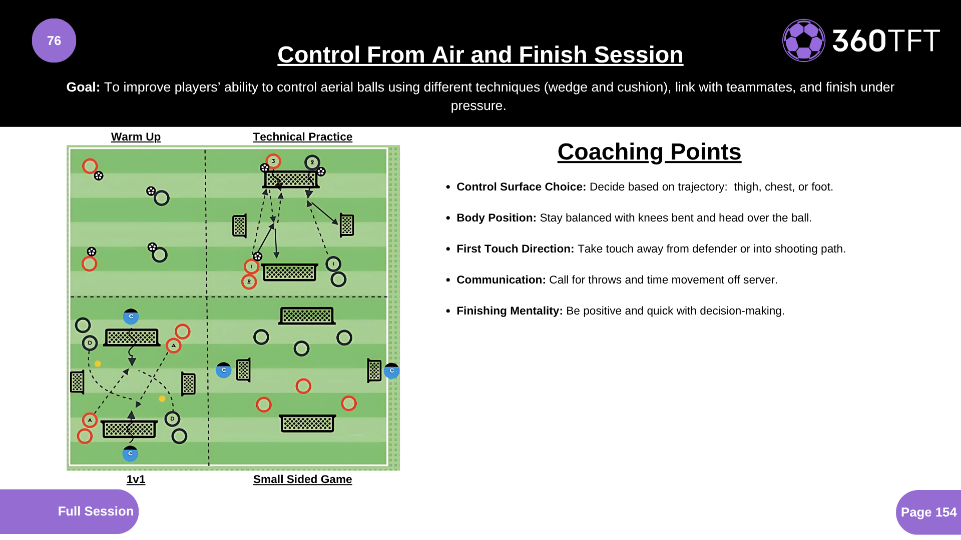 To improve players’ ability to control aerial balls using different techniques (wedge and cushion), link with teammates, and finish under pressure.