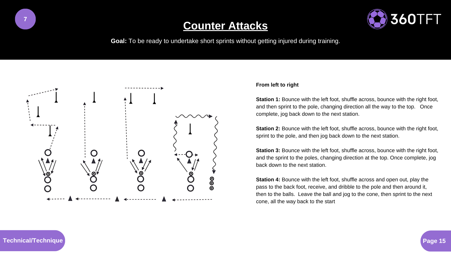 From left to right Station 1: Bounce with the left foot, shuffle across, bounce with the right foot, and then sprint to the pole, changing direction all the way to the top. Once complete, jog back down to the next station. Station 2: Bounce with the left foot, shuffle across, bounce with the right foot, sprint to the pole, and then jog back down to the next station. Station 3: Bounce with the left foot, shuffle across, bounce with the right foot, and the sprint to the poles, changing direction at the top. Once complete, jog back down to the next station. Station 4: Bounce with the left foot, shuffle across and open out, play the pass to the back foot, receive, and dribble to the pole and then around it, then to the balls. Leave the ball and jog to the cone, then sprint to the next cone, all the way back to the start.