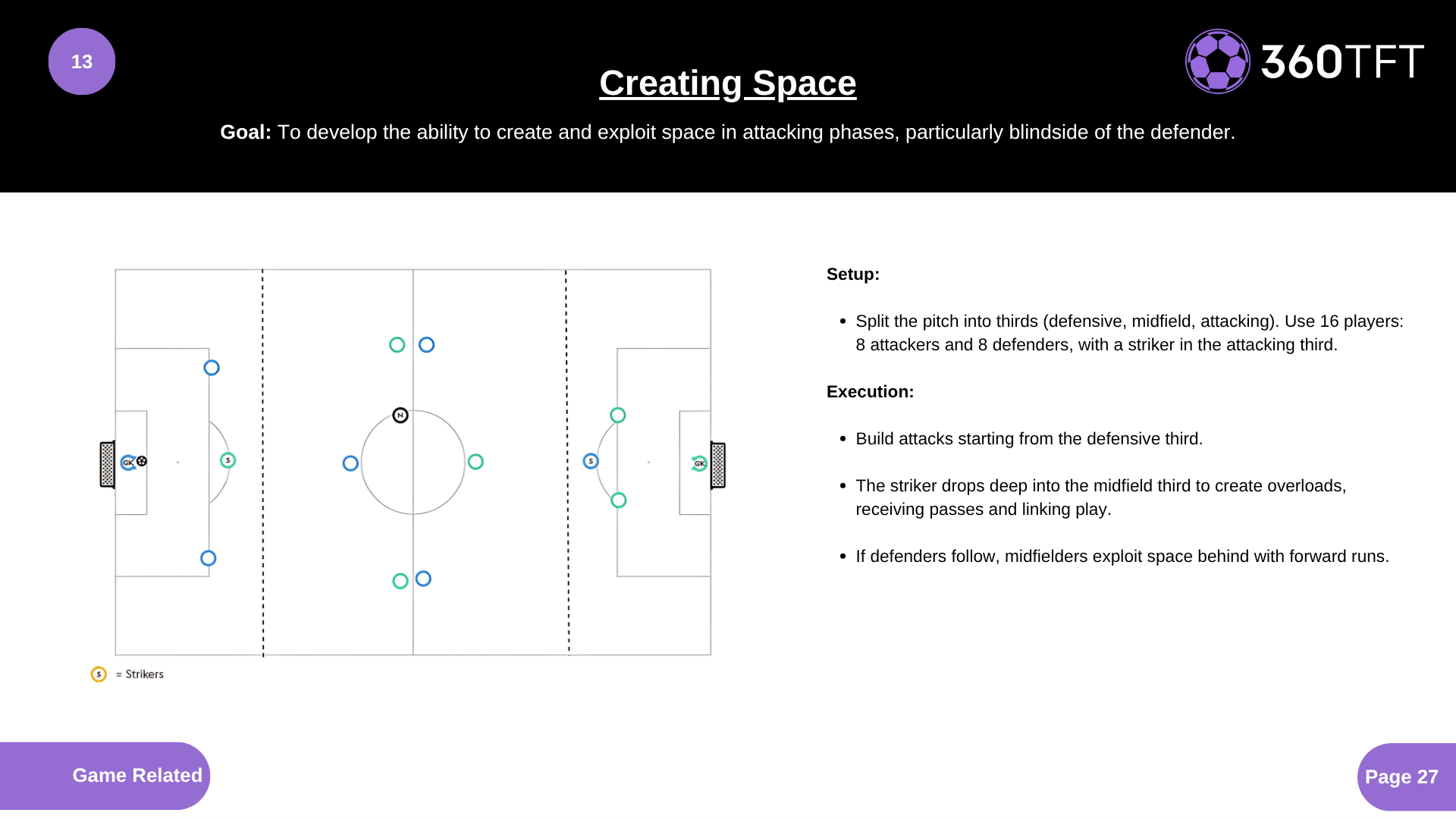 Setup: • Split the pitch into thirds (defensive, midfield, attacking). Use 16 players: 8 attackers and 8 defenders, with a striker in the attacking third. Execution: • Build attacks starting from the defensive third. • The striker drops deep into the midfield third to create overloads, receiving passes and linking play. • If defenders follow, midfielders exploit space behind with forward runs.