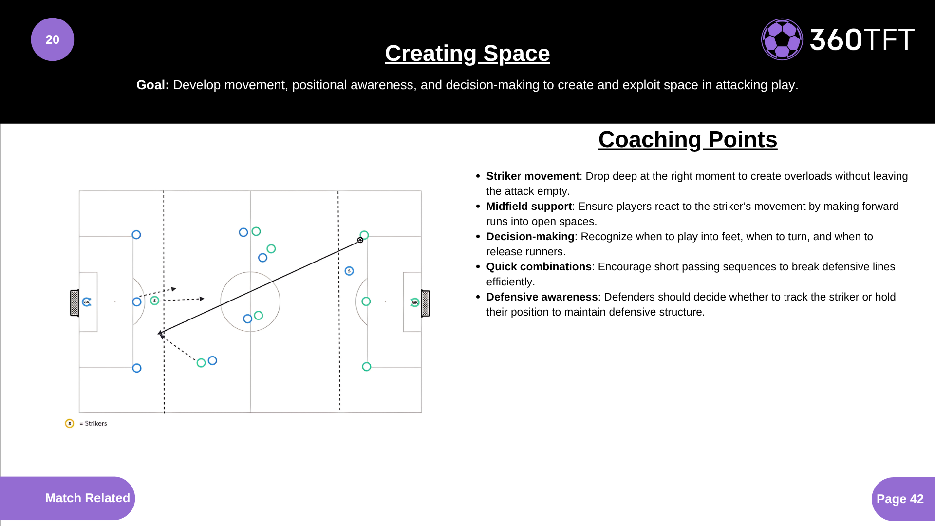 • Striker movement: Drop deep at the right moment to create overloads without leaving the attack empty. • Midfield support: Ensure players react to the striker’s movement by making forward runs into open spaces. • Decision-making: Recognize when to play into feet, when to turn, and when to release runners. • Quick combinations: Encourage short passing sequences to break defensive lines efficiently. • Defensive awareness: Defenders should decide whether to track the striker or hold their position to maintain defensive structure.