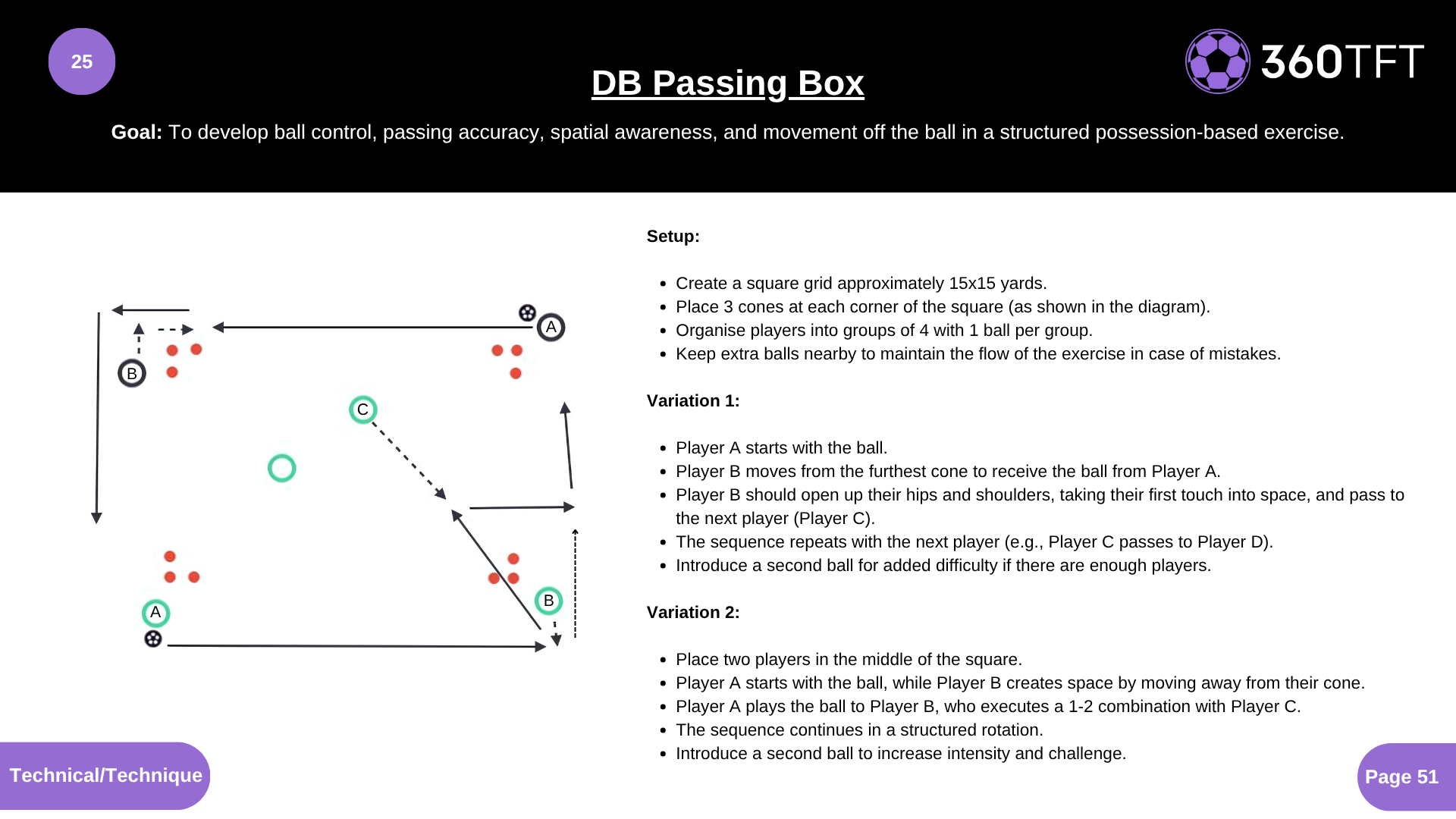 • Create a square grid approximately 15x15 yards. • Place 3 cones at each corner of the square (as shown in the diagram). • Organise players into groups of 4 with 1 ball per group. • Keep extra balls nearby to maintain the flow of the exercise in case of mistakes. • Variation 1: Player A starts with the ball. Player B moves from the furthest cone to receive the ball from Player A. • Player B should open up their hips and shoulders, taking their first touch into space, and pass to the next player (Player C). • The sequence repeats with the next player (e.g., Player C passes to Player D). • Introduce a second ball for added difficulty if there are enough players. • Variation 2: Place two players in the middle of the square. • Player A starts with the ball, while Player B creates space by moving away from their cone. • Player A plays the ball to Player B, who executes a 1-2 combination with Player C. • The sequence continues in a structured rotation. • Introduce a second ball to increase intensity and challenge.