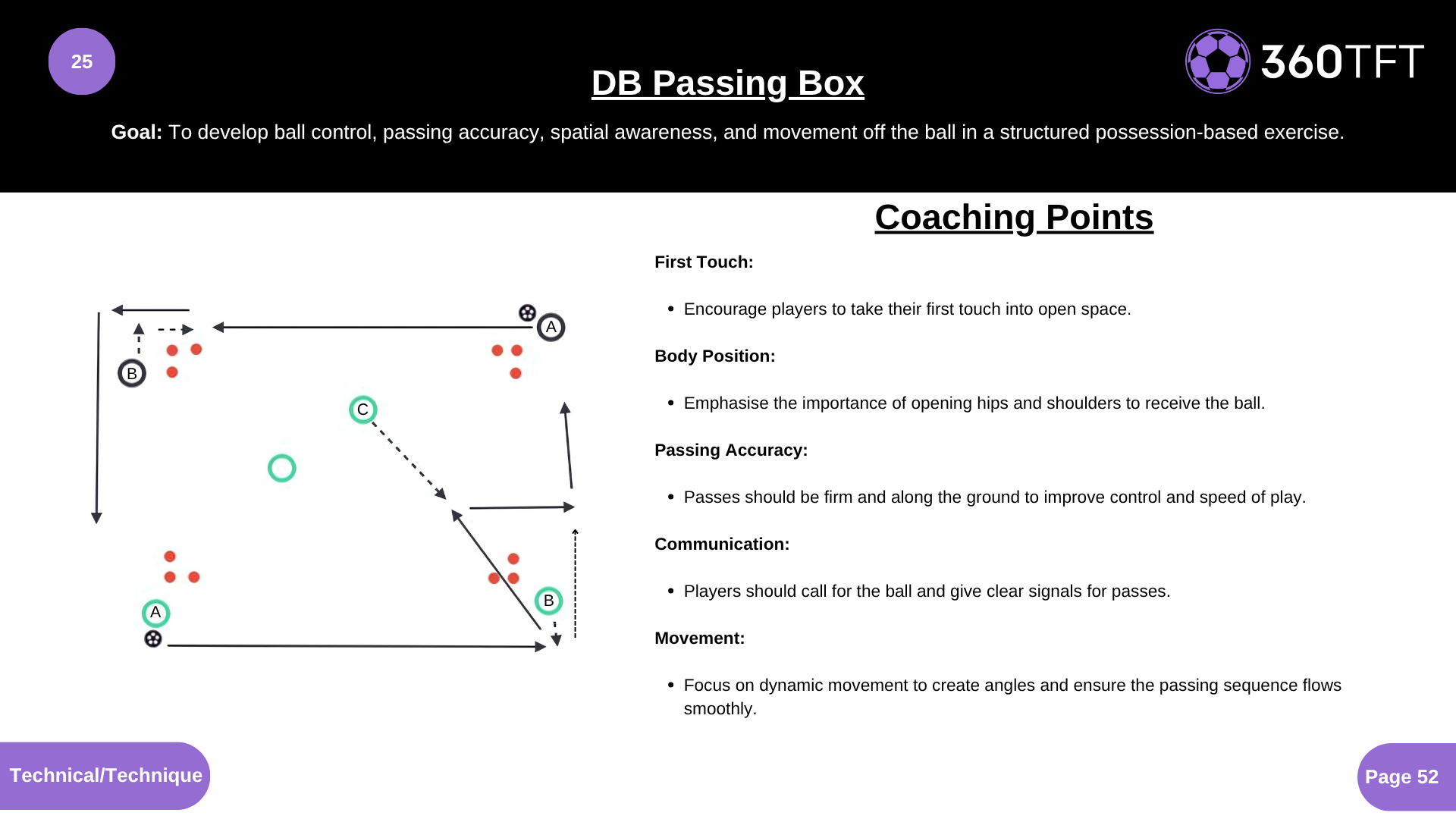 First Touch: • Encourage players to take their first touch into open space. Body Position: • Emphasise the importance of opening hips and shoulders to receive the ball. Passing Accuracy: • Passes should be firm and along the ground to improve control and speed of play. Communication: • Players should call for the ball and give clear signals for passes. Movement: • Focus on dynamic movement to create angles and ensure the passing sequence flows smoothly.