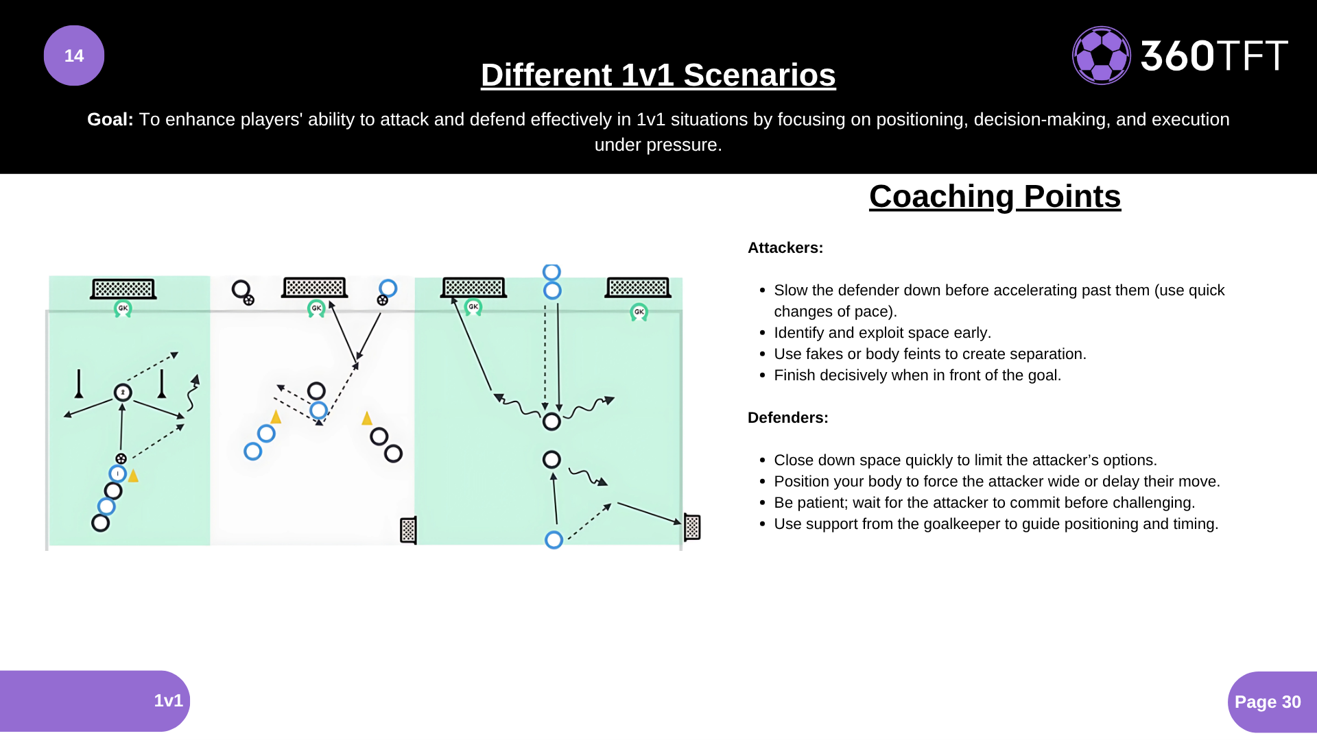 To enhance players' ability to attack and defend effectively in 1v1 situations by focusing on positioning, decision-making, and execution under pressure.