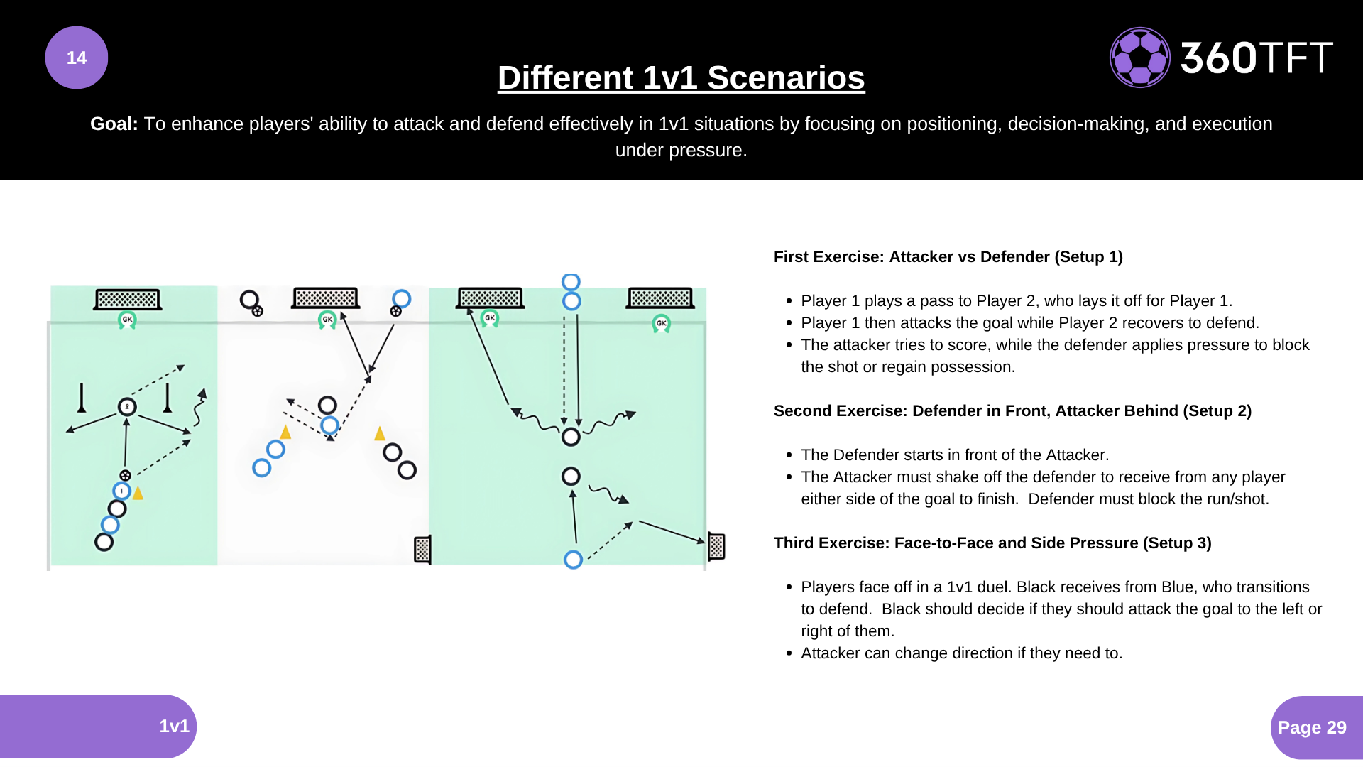 First Exercise: Attacker vs Defender (Setup 1) • Player 1 plays a pass to Player 2, who lays it off for Player 1. • Player 1 then attacks the goal while Player 2 recovers to defend. • The attacker tries to score, while the defender applies pressure to block the shot or regain possession. Second Exercise: Defender in Front, Attacker Behind (Setup 2) • The Defender starts in front of the Attacker. • The Attacker must shake off the defender to receive from any player either side of the goal to finish. Defender must block the run/shot. Third Exercise: Face-to-Face and Side Pressure (Setup 3) • Players face off in a 1v1 duel. Black receives from Blue, who transitions to defend. Black should decide if they should attack the goal to the left or right of them. • Attacker can change direction if they need to.