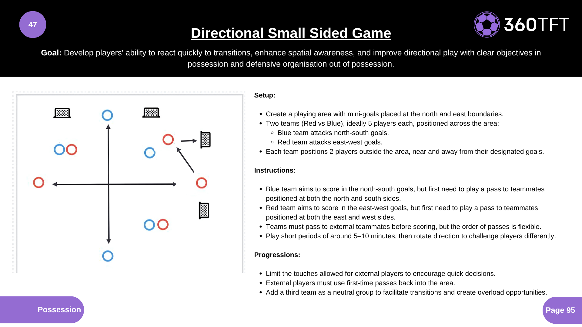 Develop players' ability to react quickly to transitions, enhance spatial awareness, and improve directional play with clear objectives in possession and defensive organisation out of possession.