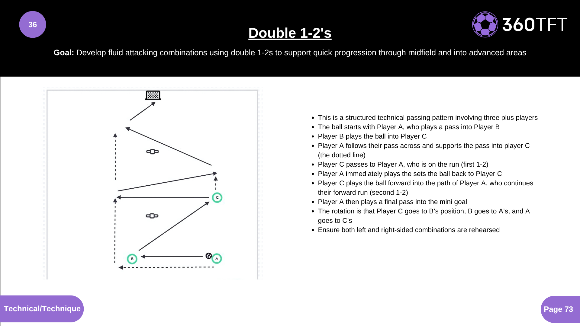 • This is a structured technical passing pattern involving three plus players • The ball starts with Player A, who plays a pass into Player B • Player B plays the ball into Player C • Player A follows their pass and supports the pass into player C (the dotted line) • Player C passes to Player A, who is on the run (first 1-2) • Player A immediately plays the sets the ball back to Player C • Player C plays the ball forward into the path of Player A, who continues their forward run (second 1-2) • Player A then plays a final pass into the mini goal • The rotation is that Player C goes to B’s position, B goes to A’s, and A goes to C’s • Ensure both left and right-sided combinations are rehearsed