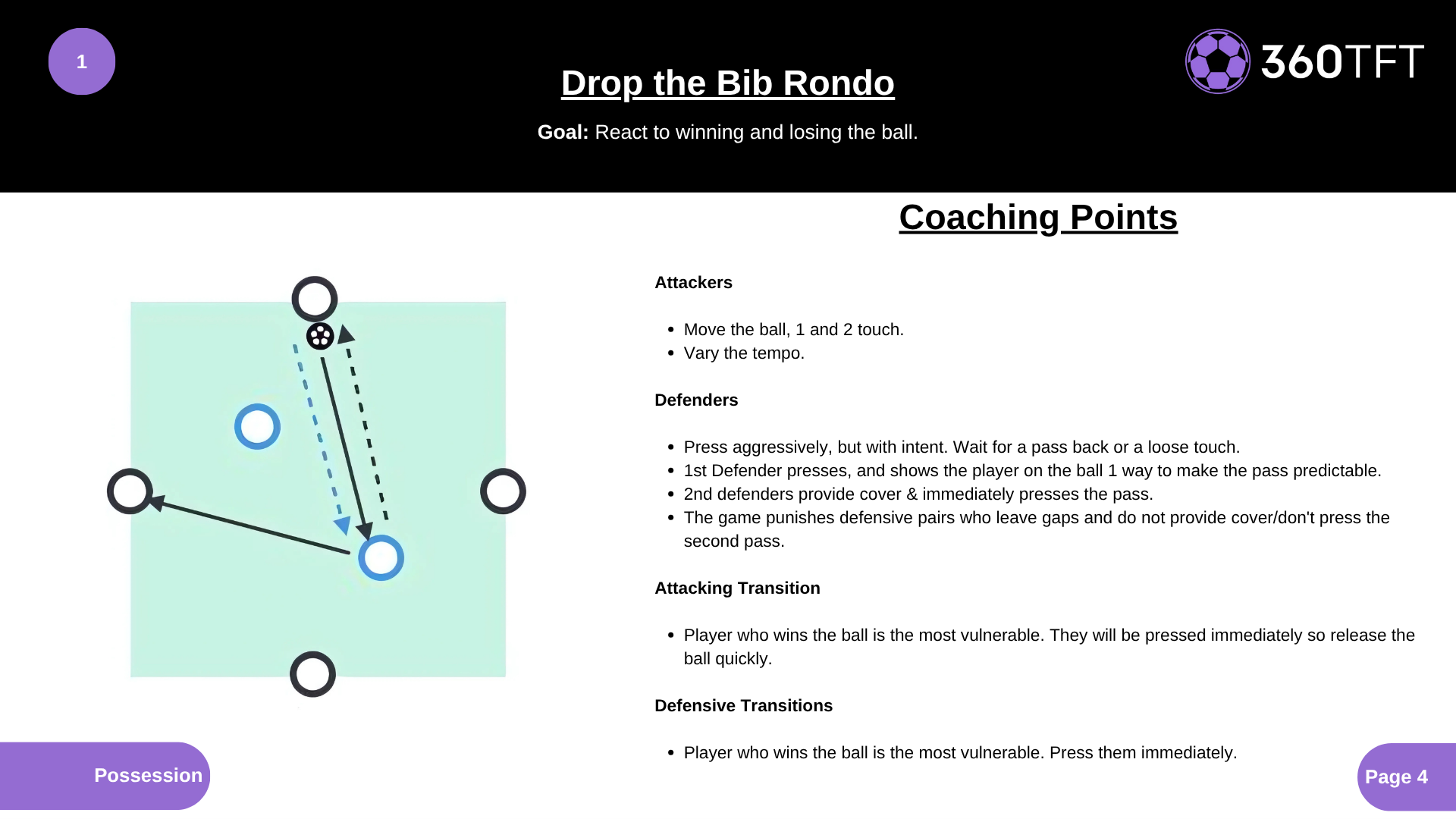 Attackers • Move the ball, 1 and 2 touch. • Vary the tempo. Defenders • Press aggressively, but with intent. Wait for a pass back or a loose touch. • 1st Defender presses, and shows the player on the ball 1 way to make the pass predictable. • 2nd defenders provide cover & immediately press the pass. • The game punishes defensive pairs who leave gaps and do not provide cover/don't press the second pass. Attacking Transition • Player who wins the ball is the most vulnerable. They will be pressed immediately so release the ball quickly. Defensive Transitions • Player who wins the ball is the most vulnerable. Press them immediately.